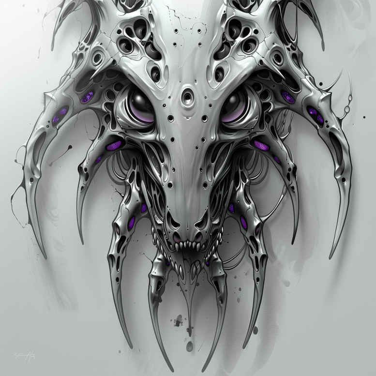 Patterned dark tentacle skull tattoo design is a bold concept that blends macabre biomorphic forms with graphic detailing. Executed in black and grey with subtle purple accents, the composition relies on crisp fine-line work, dense shading, and layered textures to create depth against the skin. The central motif is a skull-like helm from which sinuous tentacles descend, weaving around ribbed plates and rivet accents to evoke a biomechanical aura. Each tentacle features recurring micro-patterns and tapering lines that generate a hypnotic rhythm, readable as a single image at distance and as a field of motifs upon close inspection. Purple gems set in the eye sockets serve as focal points, guiding attention and anchoring contrast within the grayscale palette. The overall design balances high-contrast blocks with delicate line work, ensuring strong impact for both large-scale back pieces and smaller forearm or calf applications. As an AI-generated tattoo project, this concept offers a flexible base for a custom tattoo design: an artist can translate the pattern into a refined inked render while preserving the motif’s density and motion. The piece’s emphasis on patterning—interlacing tentacles, segmented plate textures, and rhythmic linework—also makes it well-suited as a cover-up, providing enough coverage and structure to obscure older ink. The symbolism leans into mortality, transformation, and resilience in the face of adversity, resonating with the broader lexicon of meaningful tattoos, including lotus flower tattoo, infinity tattoo, tribal tattoo motifs, rose tattoo design possibilities, small tattoos, flower tattoos, and other classic ink themes. This concept also invites reinterpretation across styles, from Japanese style tattoo to black and grey realistic tattoo, while staying true to the bold silhouette and the timeless appeal of ink on skin. In short, this tattoo design offers a dramatic, pattern-driven template for body art that can be scaled or adapted to suit a client’s narrative, ensuring a striking result when translated by a skilled artist into an actual tattoo.