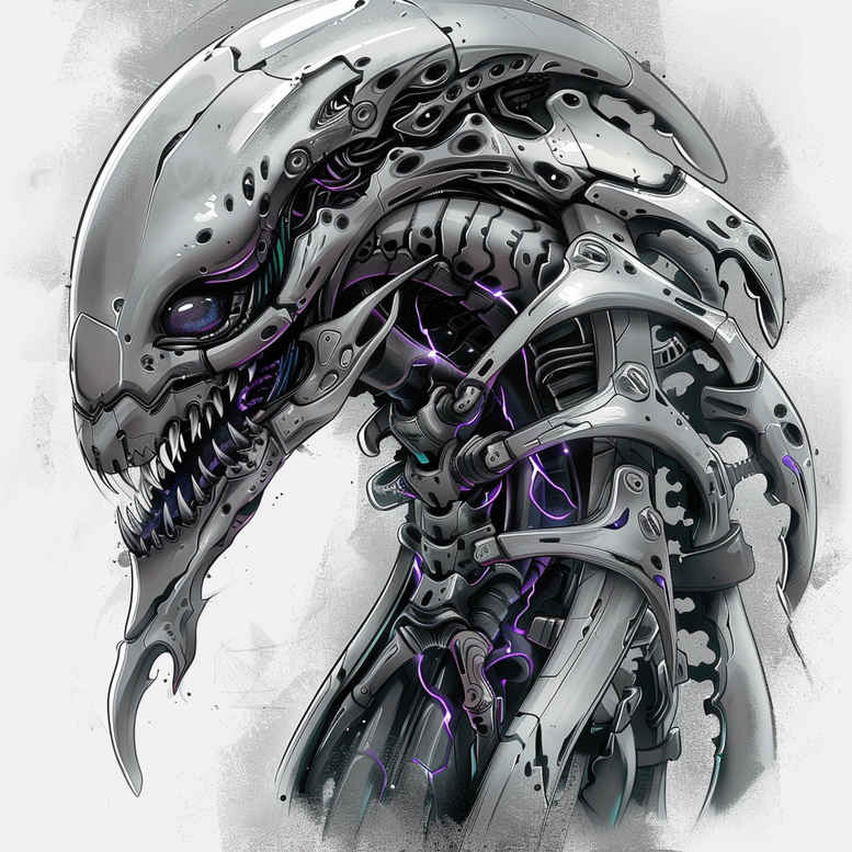 Emerging from a fusion of organic anatomy and machine, this piece presents a skull-shaped biomechanical head rendered in black and grey with subtle purple accents. The focal point is a high-relief cranium wrapped in interlocking plating, exposed turbines, and a tangle of conduits that hint at concealed circuitry beneath living tissue. The panels form graphic patterns across the surface, giving the piece a mechanical tessellation that catches light and rewards close inspection. The craftsmanship relies on a disciplined grayscale palette, with fine line work defining the cheek, jaw, and orbital cavities, while smoother shading builds volume across the helmeted profile. The contrast between hard geometric elements and organic curvature creates a dynamic tension that reads well at large scales, making it an excellent candidate for a cover-up over existing tattoos or scars. The visible components—skull, plate, cable, gear, tubing—are arranged to guide the eye along a path that suggests motion and resilience, a motif suitable for a bold back or sleeve; this design can be adapted to different body areas while preserving its impact. The piece leans into black and grey realism, with careful stippling and cross-hatching to convey texture in bone, metal, and synthetic filaments. While the concept clearly nods to biomechanical tradition, it also borrows from Japanese style tattoo’s emphasis on precision and negative space, enabling a clean transfer to skin with crisp linework. Symbolically, the skull embodies mortality and endurance, while the mechanical motifs imply resilience, reinvention, and the fusion of organic life with industry—an ideal narrative for meaningful tattoos or personal mythology. Crafted as a modern, custom tattoo design, it invites adaptation to suit sizing needs from a forearm motif to a full back piece, and its graphic complexity is well-suited for skilled artists who specialize in black and grey technique. As an AI-generated tattoo project, it demonstrates algorithm-assisted concepting’s potential for inspiring cover-up projects and complex linework, where dense shading and interlaced elements effectively conceal prior artwork while offering a striking new narrative. SEO language weaves in terms such as tattoo, tattoo design, meaningful tattoos, fine line tattoo, lotus flower tattoo, infinity tattoo, tribal tattoo, rose tattoo design, small tattoos, flower tattoos, custom tattoo design, Japanese style tattoo, black and grey, realistic tattoo, body art, ink to optimize discoverability. The approach emphasizes the artwork’s balance between detail and readability, ensuring the final tattoo reads clearly from distance while rewarding close inspection with micro-details that reward longevity and style.