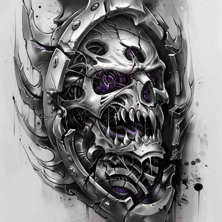 This piece presents a dark biomechanical skull entwined with gears and plates, rendered in black and grey with high-contrast shading that makes it ideal for a cover-up. The visual core centers on a skull motif fused with interlocking gears, metallic plates, and looping wires, creating a dense mechanical pattern that reads as a single, cohesive tattoo design. The composition plays with light and shadow to sculpt form, emphasizing the bone structure while letting the gearwork recede into negative space for depth. Key elements include skull, gear, plate, wire, forming a compact, high-impact motif that can anchor a larger sleeve or serve as a striking standalone piece. Technique-wise, the piece relies on crisp line work, smooth gradient shading, and careful stippling to evoke the texture of bone and metal, making it suitable for both bold black and grey realism and fine line accenting within the gearwork. Symbolically, skull motifs have long conveyed mortality and resilience, while the machinery hints at human-machine integration and endurance, offering a layered meaning for meaningful tattoos and tattoo design enthusiasts. The design’s graphic pattern adds a dynamic rhythm to the composition, suggesting movement within stillness, suitable for consults on custom tattoo design and ink planning. As an AI-generated tattoo project, this concept showcases how algorithmic creativity can produce a cover-up‑ready design with a graphic pattern that can be adapted to different skin tones and placements. In practice, the heavy shading and dense motif provide a solid base for camouflaging prior ink, while the high-contrast line work keeps edges clean for future refinements. This makes it a versatile candidate for black and grey realism, but the motifs also pair well with occasional color accents or stippled textures if a client seeks a more personal touch. The piece aligns with a range of tattoo design contexts, from realistic black and grey body art to bold industrial-inspired work, offering a strong foundation for small tattoos or larger, transformative projects that illustrate the tension between mortality and mechanization while preserving a timeless tattoo aesthetic and ink quality, with potential adaptation into rose tattoo design or lotus flower tattoo themes for broader client appeal.