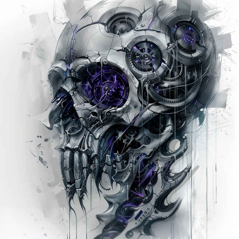 This AI-generated tattoo project concept presents a dark, highly detailed mechanical skull motif designed as a cover-up option. The central image is a skull formed by interlocking gears, pistons, and metallic plates, with a purple gem serving as an artificial eye. Black and grey shading is layered to convey depth, chrome-like reflections, and industrial weight, while fine line accents and subtle stippling add texture without sacrificing legibility on scar tissue. The design radiates from the crown into an array of cog wheels and spoke-like elements, creating a graphic surface that reads like a machine-inspired pattern and elevates a cover-up strategy. The pattern emphasis is deliberate to camouflage existing tattoos through dense linework, negative space, and measured contrast, making it a strong candidate for larger canvases, sleeves, or as a dramatic standalone piece in black and grey realism. Symbolically, the piece fuses mortality with mechanization, suggesting resilience and transformation and offering a narrative of identity forged by ink and process. For tattoo enthusiasts, this concept aligns with meaningful tattoos that tell a story, and it can be developed as a custom tattoo design that remains adaptable for black and grey realism, or with selective color accents in a future session to increase pop without compromising the core motif. It nods to Japanese style tattoo aesthetics through clean line work and balanced composition, while remaining firmly within a modern cyberpunk or biomechanical vocabulary that suits body art as a statement piece. In practical terms, the dense linework and geometric gears provide robust cover-up potential against darker backgrounds, and the pattern-centric approach allows expansion with complementary elements such as a lotus, infinity, or floral motifs in subsequent sessions. This magazine-ready brief aims to guide artists in tailoring the piece to anatomy, skin tone, and budget, while preserving the mechanical skull as the ink’s focal point and ensuring the design remains a versatile, timeless tattoo design choice within the realm of AI-generated art.