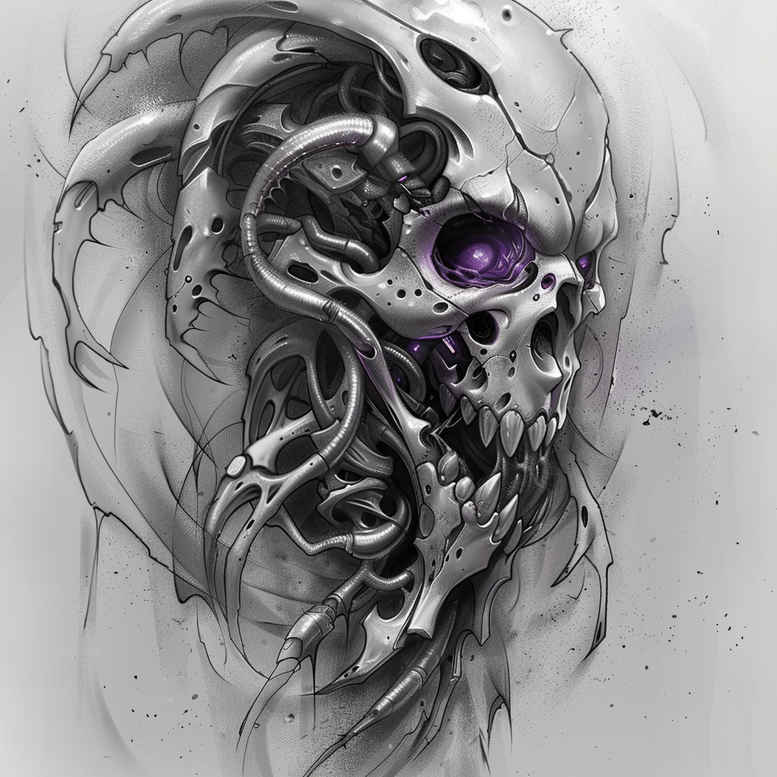 AI-generated tattoo project concept presenting a dark biomechanical skull interwoven with gears and tubes, rendered in black and grey with a purple eye accent. This tattoo design fuses skeletal realism with machine-inspired motifs to create a dramatic focal piece that can be scaled for various body areas. The central skull is overlaid by interlocking gear wheels and serpentine tubes, suggesting a fusion of flesh and circuitry. Subtle gradations of shading give dimensional depth; the purple eye provides a jolt of color that draws immediate attention while maintaining a cohesive monochrome palette. The composition leans toward bold negative space and high-contrast ink, making it an excellent candidate for cover-up work by concealing older tattoos beneath dense blackwork. In terms of symbolism, the skull signifies mortality and resilience, while the industrial elements imply transformation and resilience through adaptation—an intended meaning for a meaningful tattoo. The design nods to biomechanical and Japanese influences, with precision linework and soft gradient shading that preserves legibility on skin. For tattoo practitioners, this concept offers clear guidelines: central skull anchor, gear wheels as secondary motifs, tubular elements weaving through the composition, and a controlled splash of purple as a focal accent. As an AI-generated tattoo project, it is ready to be adapted into a custom tattoo design, sized to suit forearms, upper arms, or back, and adjustable to preserve the intended pattern and balance. The texture and contrast emphasize black and grey realism; it embraces the lineage of dark, graphic patterns while remaining versatile for cover-up applications. Keywords include tattoo, tattoo design, meaningful tattoos, fine line tattoo, lotus flower tattoo, infinity tattoo, tribal tattoo, rose tattoo design, small tattoos, flower tattoos, custom tattoo design, Japanese style tattoo, black and grey, realistic tattoo, body art, ink. If the client seeks a larger statement piece, the piece can be expanded while maintaining the core motif, ensuring the cover-up remains seamless and effective.