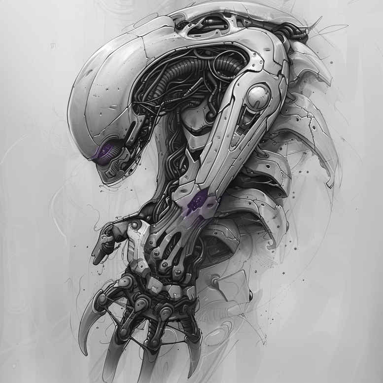 AI-generated tattoo project exploring a biomechanical aesthetic, this dark composition centers on a dragon-inspired arm motif fused with robotic plating and cables. Executed in black and grey, the design emphasizes bold linework, subtle shading, and negative space to convey a hybrid organic-mechanical form. The helmet-like surrogate head sits above a sinewy arm, linked by a network of cables that vanish into a shadowed backdrop. Key elements include the helmet, arm, cable, and plate, arranged to create a cohesive flow that can wrap around the upper arm or forearm as a cover-up-ready piece. The piece reads as a study in motion and density, where graphic patterning and textural contrasts heighten the sense of depth. This concept is an AI-generated tattoo project intended for a mature, sophisticated audience seeking meaningful tattoos with a strong visual impact. The biomechanical motif nods to cybernetic future visions, while the dark shading makes it an excellent candidate for a cover-up on existing lower-arm work. In practice, the design favors clean line, heavy grayscale shading, and refined texture to render a realistic tattoo illusion on skin. It blends the heritage of black and grey realism with futuristic biomechanical patterning, offering versatility for small tattoos or a larger sleeve extension. The composition uses interlocking plates and sinewy tendons to convey rigidity and motion, while the purple accents punctuate focal points without overpowering the grayscale tempo. From a tattoo design perspective, this concept demonstrates how graphic patterns can be woven into a cohesive narrative—turning a bold, dense motif into a wearable body art statement. For practitioners, the work provides guidelines on shading gradients, edge definition, and layering to maintain readability as skin ages. As an expressive tattoo concept, it invites interpretation around technology, resilience, and metamorphosis, while remaining aligned with modern black and grey realism and the Japanese-inspired attention to line quality. The AI origin underscores this as an explorative, concept-driven project aimed at informing real-world commissions, and its cover-up potential makes it a practical choice for clients seeking to replace ink with something more enduring. In short, this pattern-rich biomechanical design offers versatility for small tattoos or extended pieces that celebrate the craft of custom tattoo design and ink storytelling.