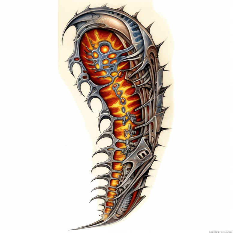 This image presents a dragon-inspired tattoo design that blends mythical form with mechanical armor. Rendered in bold full color, the central orange spine glows against black and gray plates, while the surrounding scales and jagged edges create a graphic, pattern-rich texture. The creature coils in a sinuous arc, making it ideal for placement along the shoulder, ribs, or thigh. Crisp line work, smooth gradients, and careful shading give a lifelike yet stylized look, with a pronounced spine, horns, and teeth forming a strong silhouette. Key elements—dragon body, armor, spine, horn, teeth, and curling tail—establish rhythm and move the eye along the curve of the design. Symbolically, dragons signify strength and transformation, while the armor conveys resilience and protection; the orange spine adds energy within the grayscale framework. This concept functions as a versatile tattoo design that can become a larger sleeve or chest piece, or stand as a striking small tattoo. Because of its dark shading and bold contours, it also serves as a solid cover-up option for existing work, where the patterning can mask underlying shapes while introducing fresh meaning. As an AI-generated tattoo project concept, it demonstrates how graphic patterning and color accents inform custom design decisions for clients seeking meaningful tattoos, including Japanese and fantasy influences, and modern body art. The piece invites refinements in line thickness, gradient transitions, and color balance, enabling a truly personal custom tattoo design. In short, the design marries timeless dragon symbolism with contemporary shading and pattern work, offering a powerful template for body art that can be tailored to individual anatomy and style.