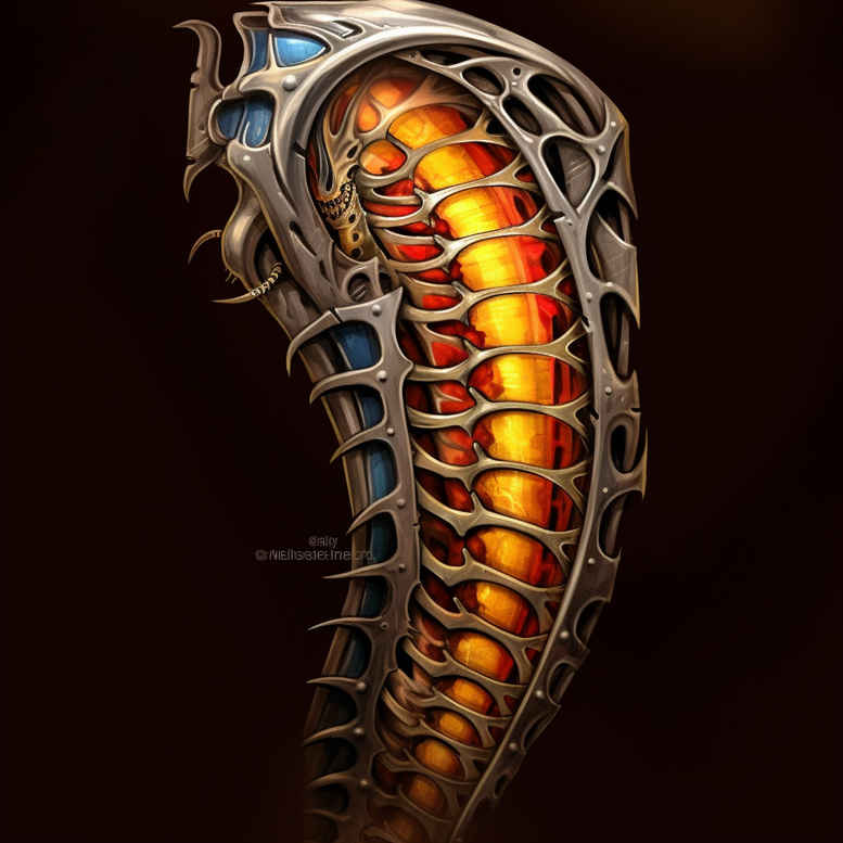 An AI-generated tattoo project exploring a dark biomechanical spine wrapped in a molten-orange glow. The curvature reads as a stylized column of vertebrae, each segment edged by a sculpted lattice that echoes machinery and bone in equal measure. Rendered in black and grey with selective color, the piece emphasizes clean linework, subtle shading, and negative space that allows the orange accents to pop. The design balances anatomical plausibility with graphic ornamentation, making it suitable for a cover-up when applied to a larger canvas on the back or rib cage, while still working as a bold forearm piece for fans of industrial aesthetics. The ribcage elements merge with an interlocking lattice pattern, creating a dynamic sequence that suggests motion and energy, a motif that could translate into a larger sleeve or a chest panel. The overall effect is both dark and luminous, with a sense of molten energy flowing along the spine. Technically, the tattoo is rendered with crisp contour lines, gradated shading, and strategic contrast to ensure readability on skin, even aging. The piece can be adapted to various skin tones and sizes through line density and color weight. Its symbolism evokes endurance, transformation, and the fusion of organic form with engineered structure, aligning with meaningful tattoos and custom tattoo design approaches. While the current image is AI-generated as a tattoo concept, a skilled tattoo artist can translate the biomechanical spine into a permanent body art piece, whether in black and grey or limited color schemes. The motif aligns with Japanese style tattoo influences through flowing curves and symmetry, while the central spine echoes the idea of an infinity tattoo in its perpetual loop of vertebrae; overall, this pattern-rich concept remains adaptable for small tattoos or grand backpieces, and it highlights how a cover-up-ready design can turn a dark canvas into a standout statement. The narrative also embraces the broader dialogue around ink, body art, and wearable symbolism, inviting clients to explore personal meaning through a custom tattoo design that blends science-inspired geometry with organic contouring.