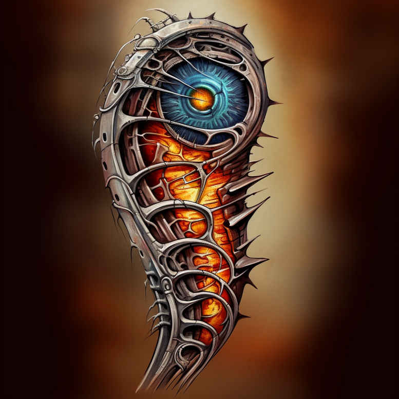 This AI-generated tattoo project presents a dark, highly detailed steampunk seahorse design conceived as a bold cover-up concept. The serpentine form coils upward along the skin, its spine lined with circular gears and turbine-like discs that glow with a fiery orange core while a cobalt blue eye crowns the head. The base palette is black and grey, enhanced by selective orange and blue highlights to simulate chrome plating, heat, and depth against a near-black background. The mechanical segments create a geometric pattern along the body, providing rhythm and texture that reads as both sea life and machine—an effect that also suits graphic patterns in tattoo work. While rooted in the mechanical aesthetic, the piece translates well into a realistic tattoo style, with crisp line work and smooth shading that support options from fine line tattoo to bold black and grey body art. As a meaningful tattoo concept, it speaks to themes of resilience and transformation—nature fused with invention—making it adaptable to personal symbolism, including infinity motifs, lotus flower tattoo inspiration, or rose tattoo design ideas embedded in the hardware, and a nod to Japanese style tattoo line work. The design is ideal for small to medium coverage areas and excels as a cover-up due to its dense shading and high contrast that can mask older ink. Created as an AI-inspired study, it illustrates how algorithmic design can inform custom tattoo design discussions, offering a practical blueprint for artists and clients seeking a unique, wearable piece. Placement can be tuned to forearm, calf, or shoulder, with adjustments to scale, tone, and line weight to suit individual anatomy and skin tone, while preserving the artistry’s meaning for meaningful tattoos and ink.