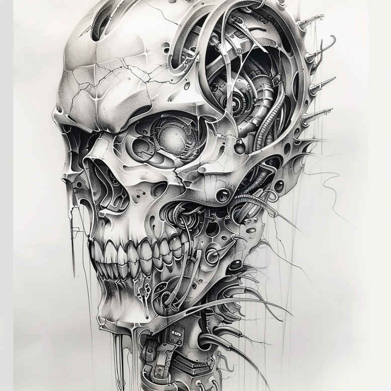 AI-generated tattoo project presenting a dark, highly detailed skull concept that fuses bone anatomy with biomechanical geometry. The focal point is a realistically shaded skull rendered in black and grey, its hollows and contours enhanced by a lattice of gears, tubes, and twisting cables that seem to emerge from the cranium and spill along the neck like a mechanized extension of the body. Graphic patterns of cogwork and sinew create a rhythmic flow across the design, yielding a dense, textile-like texture that reads beautifully at both small and large scales. The shading travels from velvety gradients to razor-thin line work, delivering depth to the teeth, eye sockets, and jaw while the machine elements cast crisp highlights that mimic metal surfaces. The composition is deliberately packdense, making it an ideal candidate for a cover-up: the dark spaces and overlapping motifs provide a strong canvas to conceal existing ink while letting new lines integrate with the surrounding skin. Visible elements include skull, gears, cables; the gears punctuate the temporal region, cables thread along the jaw and under the cheek, while the shadowed skull forms a dramatic negative space that anchors the piece. The piece sits at the intersection of realism and mechanical fantasy, suitable for a large back piece or a bold forearm portrait, and can be adapted in scale, orientation, and gear motif to suit individual anatomy. Symbolically, the skull anchors themes of mortality and resilience, while the embedded machinery speaks to endurance, transformation, and the fusion of humanity with technology—a recurring motif in modern tattoo design. For collectors seeking meaningful tattoos, this project offers a striking, long-lasting black and grey design, leveraging realistic shading and strong contrast to achieve a timeless body art statement. As an AI-generated tattoo project, it offers a ready-to-translate concept for tattoo artists to reinterpret, refine, and customize to the wearer’s story and anatomy, with explicit emphasis on cover-up viability due to its dense composition and layering of dark elements.