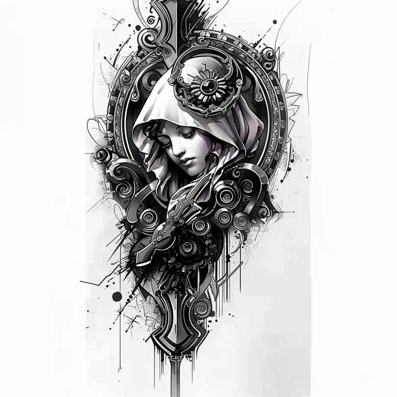 This monochrome tattoo design concept presents a hooded woman rendered in black and grey through precise fine-line technique, where crisp outlines meet subtle shading and deliberate negative space to sculpt a poised, enigmatic silhouette. A floral ornament threads through the hood and the figure’s neckline, while intricate ornamental filigree and ink-drip accents create a sense of motion and depth, balancing rigidity with fluidity. The high-contrast black inks are moderated by layered greys, allowing tonal gradation that remains legible on skin over time, a hallmark of quality fine line work in tattoo design. The piece invites interpretation: the flower motif symbolizes resilience, renewal, and growth, while the surrounding motifs imply heritage, protection, and memory; together they form a meaningful tattoo design that can be expanded with additional blossoms, trailing vines, or shifting compositions to suit personal narratives. From a technical perspective, the design emphasizes line economy, careful needle selection, and controlled shading to sustain crisp edges, ensuring the work ages gracefully on larger canvases such as the back, shoulder, or ribcage, yet still reads well as a smaller tattoo when simplified. The pattern-rich composition supports customization toward lotus flower tattoo or rose tattoo design, and it can be adapted with Japanese style tattoo cues, tribal linework, or more realistic texturing, all while preserving the core black and grey aesthetic and the delicate fine-line sensibility. For clients seeking small tattoos or bold statements, the central figure offers a strong anchor for additional elements or sleeves, while the floral and ornamental details provide ample space for meaningful symbolism and personal storytelling. This AI-generated tattoo project concept demonstrates how a monochrome narrative can be translated into a client-ready tattoo design that blends contemporary sketch aesthetics with timeless motifs, appealing to fans of meaningful tattoos, black and grey realism, and refined body art. The design’s density and contrast also make it an attractive option for cover-up work, offering ample dark space to conceal existing ink if necessary while maintaining a striking silhouette.