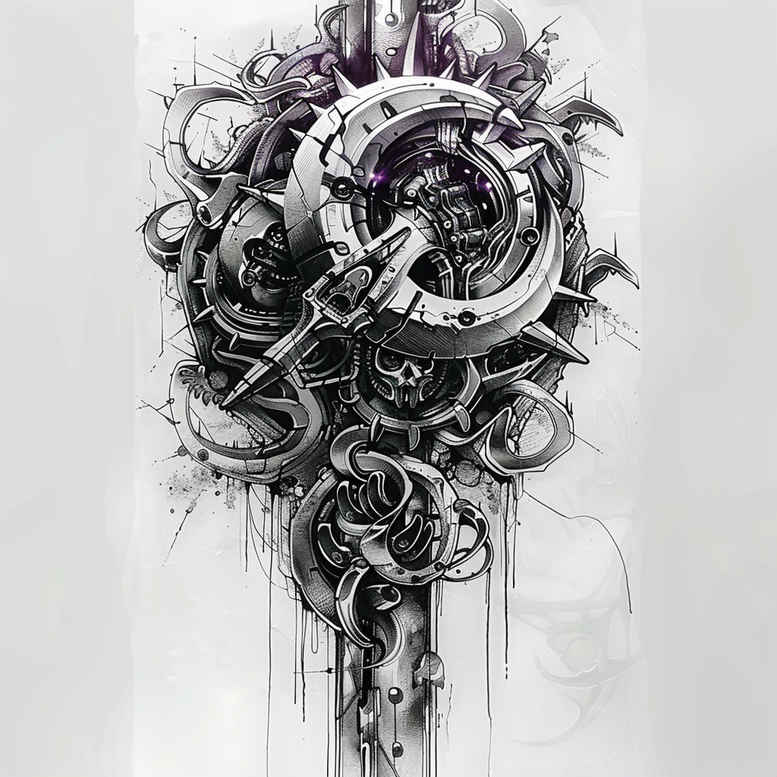 AI-generated tattoo project concept presented here showcases a dense, dark mechanical composition designed for bold body art. The central motif is a gear wheel, surrounded by interlocking rings and a chain-like framework that cascades into elongated drips, creating a vertical focal point that anchors the piece. Executed in black and grey, the shading builds depth through cross-hatching, rim shading, and soft smudges that mimic worn metal and ink. The pattern-like arrangement emphasizes repetition and motion, reading as both a technical diagram and a stylized ink illustration. Although dominated by negative space and high contrast, crisp fine line accents peek through, giving a sense of precision and control that appeals to fans of realistic tattoo and modern mechanical motifs. While the design leans into blackwork and industrial textures, it also nods to Japanese style tattoo influences through densely packed texture and careful gradation, a quality sought after in custom tattoo design and small tattoos alike. The work references broader symbolic language: gears for time and resilience, chains for constraint and the possibility of release, and a downward cascade that can be interpreted as a statement of transformation. For a cover-up client, the piece’s heavy mass and pattern density provide a reliable foundation to mask prior ink, with the ability to adjust coverage and flow to body curvature. The concept is scalable from back panels to forearms, and its geometric rhythm can be tuned to suit lotus flower tattoo, infinity tattoo or rose tattoo design themes if desired, though the current motif emphasizes industrial pattern more than florals. This is clearly an AI-generated tattoo project, intended to explore cover-up-ready geometry, bold contrast, and pattern-rich texture. In sum, the design blends black and grey realism with mechanical iconography, offering a strong, striking option for those seeking meaningful tattoos, a tattoo design that speaks to resilience and interconnectedness, and a contemporary body art statement that remains versatile across sizes and placements. The technique supports a long-lasting inked surface with careful line weights, shading, and fade control that will read well on skin.
