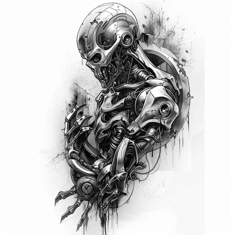 AI-generated tattoo project concept presenting a biomechanical skull in black and grey, carved with interlocking gears, cables, and rib-like elements across a dark torso. The design reads as a single, cohesive motif intended for sleeve-ready placement, blending realism with mechanical abstraction so the skin becomes a stage for texture and shadow. The focal point is a skull forged from plates and pistons, its hollow eye sockets reflecting a quiet menace while gears mesh with sinewy tubing to form a dynamic silhouette. The ribcage and chest unite into a continuous pattern that flows along the body, creating space for additional ink or healing around the edges. The technique relies on high-contrast black and grey shading, with soft gradient washes and explicit linework to enhance depth, metallic sheen, and tactile texture without introducing color. This concept embraces a biomechanical aesthetic, balancing organic bone cues with industrial machinery to express resilience, metamorphosis, and the fusion of human and machine. The composition is designed with cover-up in mind: dense, dark shading can obscure earlier tattoos or blemishes, while the negative areas can be repurposed for future sessions, ensuring versatility for ongoing work. For clients, the piece offers a bold, meaningful statement that remains adaptable to future additions or style shifts. For artists, the design presents opportunities to refine needle technique—from bold outlines to delicate stippling and whip shading—to achieve a believable metal finish and a convincing skin-tone transition within a black and grey palette. This concept is an AI-generated tattoo project, illustrating how digital ideation can translate into a compelling, graphic body art design suitable for skin. In sum, the biomechanical skull motif provides a powerful, durable option for a cover-up that embraces a striking pattern while remaining compatible with larger body art narratives.