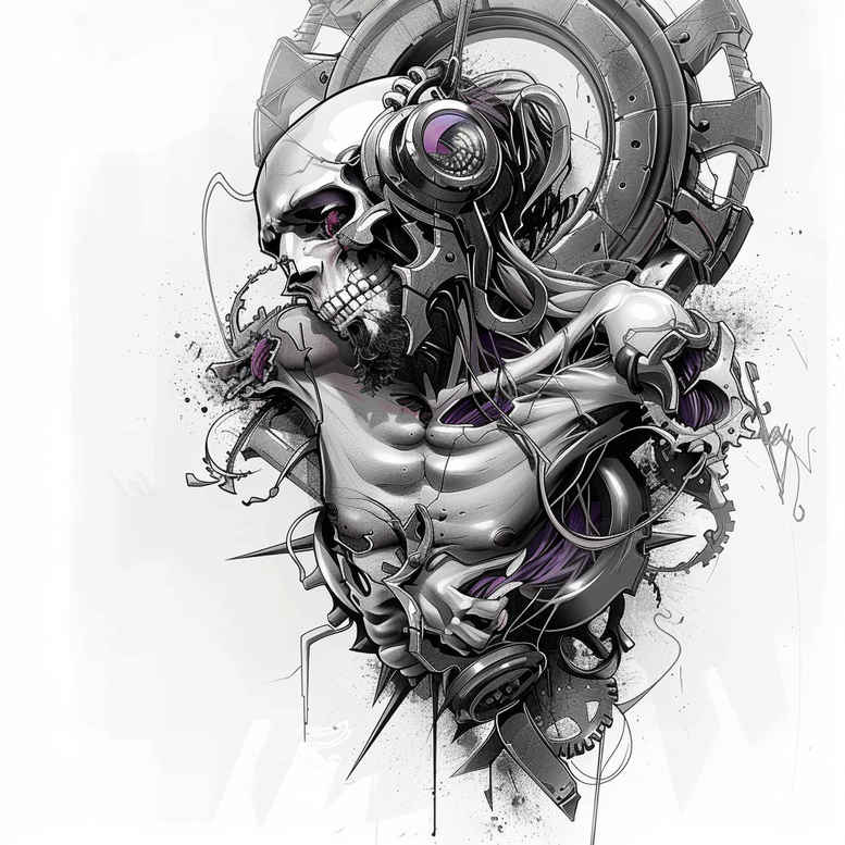 AI-generated tattoo project. This dark biomechanical skull piece fuses bone with machinery in black and grey to create a dramatic focal point suitable for a cover-up. The central skull is sculpted with fine line detailing; behind it a ring of gears and a circular gauge adds motion, depth, and a sense of time and mechanism. Wavy tendrils weave through the composition, while slim cables trail outward, suggesting a fusion of organic and cybernetic forms. Tiny violet gem accents punctuate the grayscale palette, providing restrained points of color that enhance contrast without breaking the monochrome mood. The design reads as both realistic in shading and graphic in silhouette, making it adaptable to large areas such as sleeves or backs, as well as a bold standalone piece. The tattoo design is ideal for cover-up projects because heavy black shading can mask underlying work while intricate linework builds texture and interest that remains legible over time. The motif blends skull symbolism—mortality and resilience—with mechanical evolution, a theme well suited to meaningful tattoos that signify transformation and endurance. Techniques emphasize contrast, stippling, and subtle gradient transitions to preserve clarity across skin tones; ink density can be tuned to ensure longevity of lines. Interpreted through a neo-traditional lens, the composition can be refined to emphasize or downplay gears and gauge, allowing a bespoke path for client preferences. Placement suggestions include the upper arm, chest panel, or back—each offering space for negative shapes on the periphery to balance the heavy central image. Overall, this piece embodies dark elegance and industrial energy, a cover-up capable design for those seeking strong body art with lasting impact, and it aligns with modern tattoo design discourse on realism, black and grey shading, and meaningful tattoos.