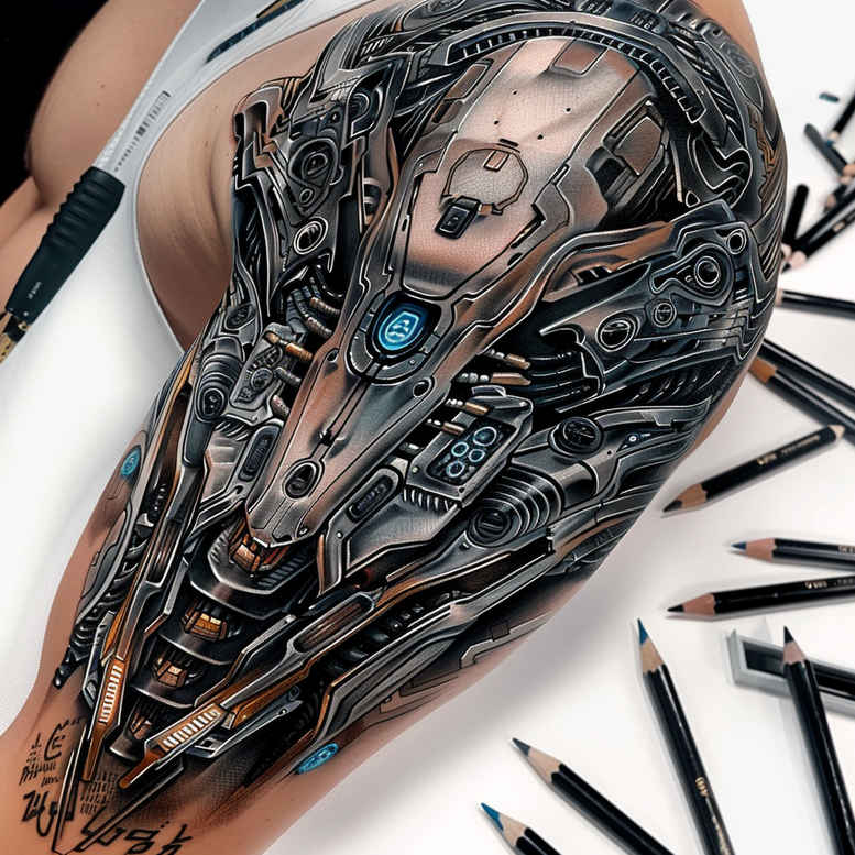 This AI-generated tattoo project concept presents a dark biomechanical skull tattoo design etched along the forearm in black and grey. The central motif is a stylized skull anchored by interlocking gears, pistons, and rib-like elements that create a sense of motion and depth. A cobalt-blue gem serves as a focal point, drawing the eye to the heart of the machine, while fine line shading emphasizes micro-detailing and texture. The composition blends organic and mechanical textures, with ribbed plating and delicate wires weaving through the design, suggesting both protection and vulnerability. The piece sits on the forearm with a natural flow that accommodates negative space and potential future additions. This tattoo design sits well as a stand-alone statement or as a cover-up, where dark shading can obscure existing marks and blend with the new machinery. The concept leans into the biomechanical style, realized through black and grey gradients, stippling, and crisp linework that mimic metallic surfaces and weathered chrome. Its meaning can be interpreted as resilience, durability, and the fusion of human and machine – a metaphor for personal evolution, endurance, and the relationship between body art and identity. The use of a blue gem injects a hint of color contrast within a monochrome palette, enhancing focal points without breaking the grayscale harmony. For tattoo enthusiasts, this design offers a high-contrast, long-lasting option that suits those seeking a sizable forearm piece with intricate pattern work and mechanical accuracy. In terms of technique, expect a mix of fine line work for the intricate engravings, smooth black-and-grey shading for depth, and precise rendering of gears and tubing to achieve a realistic, tactile appearance. As a bespoke concept, it invites customization in scale and placement and aligns with modern body art trends in ink, custom tattoo design, and black and grey realism. Note that this is an AI-generated tattoo project concept; if implemented, the result would be a striking example of cover-up capability where older tattoos are integrated into a cohesive new biomechanical statement. The pattern-rich motif ensures a dynamic visual story across the forearm, inviting experimentation with texture, light, and depth.