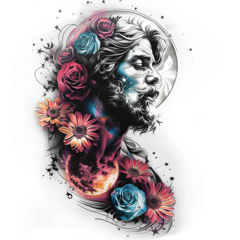 AI-generated tattoo project concept: a vibrant watercolor floral portrait that merges botanical softness with lunar mystery. The centerpiece is a profile of a woman’s face, rendered with fine line precision and gentle shading, surrounded by blooms—pink roses and a blue flower—set against a circular moon that sits behind the head, while the neck line grounds the composition. The design uses watercolor washes, splatter edges, and crisp black ink for definition, producing a lively yet legible tattoo that can age gracefully on the skin. Symbolically, the roses speak to beauty, passion, and resilience, while the moon suggests introspection and change; together they create a meaningful narrative that resonates with the tattoo design theme and with flower tattoos, especially the rose tattoo design. The piece is scalable: it can be adapted for small tattoos or expanded into a larger sleeve or back panel, and it can be realized as a fine line tattoo with delicate outlines or a more painterly, realistic tattoo depending on needle selection and ink density. The floral pattern rhythm across the composition makes it suitable for pattern-inspired translations, and it can be reinterpreted in Japanese style tattoo motifs or in black and grey for a subtler look, or in full color for a bold statement. The concept embraces the current interest in meaningful tattoos and botanical body art, while offering versatility for custom tattoo design and ink choices. The finish can be adjusted for placement on the wrist, shoulder, or thigh, with attention to line contrast and color saturation to ensure readability at aging. As a flexible concept, it supports variations such as lotus or infinity motifs, additional tribal line accents, or a more minimalist rendition. This concept is an AI-generated tattoo project concept, illustrating how digital generation can inform traditional tattoo workflows and optimization for search terms such as tattoo, tattoo design, meaningful tattoos, fine line tattoo, lotus flower tattoo, infinity tattoo, tribal tattoo, rose tattoo design, small tattoos, flower tattoos, custom tattoo design, Japanese style tattoo, black and grey, realistic tattoo, body art, ink.