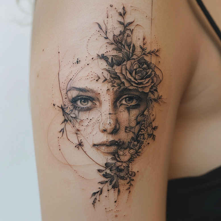 This elegant black-and-grey tattoo design presents a refined portrait of a woman’s face intertwined with botanical motifs. Executed in a delicate fine-line technique, the piece relies on crisp lines, subtle shading, and deliberate negative space to convey quiet expressiveness and motion. The central figure—the woman’s face—emerges from an organic web of winding vines and scattered leaves, creating a seamless dialogue between portrait and flora. The composition emphasizes restraint: thin contours define facial features while slender stems drift across the skin, allowing the eye to travel the composition without being overwhelmed by ink density. The botanical elements function as symbolic punctuation, suggesting growth, resilience, and transformation, and they lend a timeless, almost ethereal quality to the work. From a technical standpoint, the tattoo demonstrates controlled line weight, precise saturation, and careful placement on the forearm to maximize readability as a standalone piece or as a foundation for a larger sleeve. The black-and-grey palette supports a versatile range of skin tones and aging behavior, ensuring the design remains legible over time. For those seeking meaningful tattoos, this piece blends fine-line realism with floral symbolism—an accessible entry point to lotus flower tattoo motifs, infinity tattoo lines, tribal-inspired shading, and Japanese-style influences while maintaining a contemporary sense of realism and restraint. As a customized design, it can be adapted to different scales or combined with other floral elements, such as roses or cherry blossoms, to tailor symbolism to the wearer. Overall, it is a refined study in line work, texture, and composition, suitable for fans of small tattoos and portrait-inspired body art in black and grey ink. If the wearer contemplates a cover-up, the design can be intensified with darker shading around the edges or adjusted to align with scar camouflage, but the current presentation already offers a timeless, versatile tattoo design that speaks to personal meaning and artistry.
