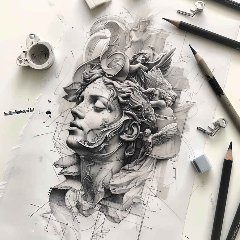 AI-generated tattoo project concept presented as a refined pencil study, this piece captures a poised portrait framed by a floral crown rendered in soft, precise lines. Executed in black and grey, the design leans toward a fine-line tattoo aesthetic, with delicate cross-hatching and subtle gradient shading that build form without overpowering the line work. The portrait sits as the central focal point, its profile expressed through careful contouring of the brow, nose, and lips, while the floral crown introduces organic movement that guides the eye around the composition. Leaves and petals unfurl around the head, adding texture and natural symbolism: growth, renewal, and beauty intertwined with identity. The technique emphasizes light-to-dark value shifts to convey depth on skin—an ideal approach for tattoo designers seeking longevity of line precision when inked as a small tattoo or a larger piece. The study also offers versatility for placement on shoulder, back, or forearm, functioning as a standalone portrait or as a component of a broader body art concept. For those exploring meaningful tattoos, this concept fuses portraiture with botanical symbolism, presenting a refined platform for a custom tattoo design that can be tailored to fit different skin tones, placements, and narratives. While this is an AI-generated tattoo project concept, it remains grounded in practical application: the composition invites collaboration with a tattoo artist to translate the pencil study into durable ink, balancing line work with shading, texture, and negative space. In its clean black and grey palette, the piece aligns with realistic tattoo traditions while offering a contemporary fine-line interpretation that suits both small tattoos and larger canvases, making it a versatile reference for ink and design exploration in tattoo studios and magazines. The floral crown’s flowing lines recall Japanese-style tattoo linework, while the restrained shading supports a realistic impression that translates well to a black and grey palette for a lifelike portrait. Artists can evolve this concept into an infinity tattoo motif by weaving subtle vines, or pair it with a rose tattoo design to express memory and growth. The composition also works as a daily reminder for meaningful tattoos, adaptable for small canvases or expansive back pieces. In short, this AI-generated tattoo project concept demonstrates how digital ideation can inform traditional ink, inviting collaboration with an artist to tailor placement, scale, and narrative while preserving the integrity of time-tested techniques like fine-line precision and botanical symbolism.