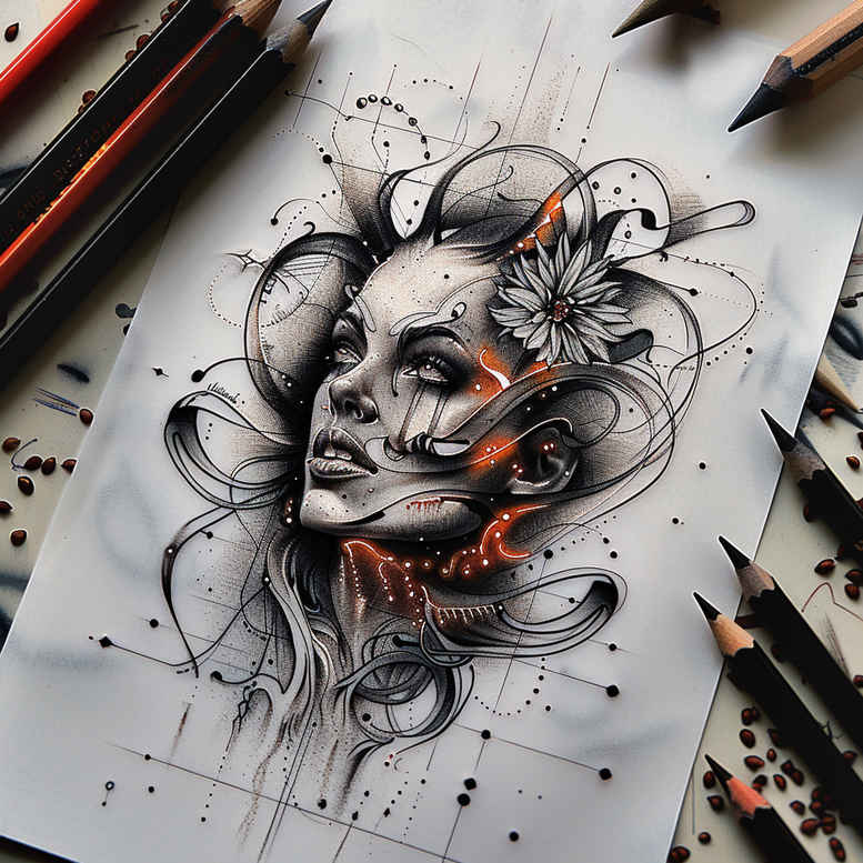 AI-generated tattoo project details a refined black and grey portrait intertwined with ornamental florals. Rendered as a fine line tattoo concept, the piece relies on precise linework, subtle shading, and delicate stippling to preserve a lifelike presence while keeping a light, wearable aesthetic. The central image is a half-profile face that communicates calm introspection, with flowing blossoms, leaves, and tendrils curling around the head and neck. The floral motifs act as a natural frame, connecting the portrait to negative space and enabling adaptable placement on the body. Although grayscale dominates, selective orange accents highlight key petals, creating a focal point that remains tasteful in skin tone. The composition uses rhythm and balance, with recurring curves guiding the eye from the forehead through the cheek and down toward the clavicle, a layout conducive to wrap-around or cover-up scenarios where older ink needs concealment. The aesthetic nods to Japanese style tattoo traditions through structured linework and floral silhouettes, yet it remains firmly a realistic tattoo concept suitable for contemporary body art. The graphic patterning—the repeating petals, entwined stems, and sprinkled stipple—gives the design a strong, repeatable pattern quality that can be scaled up for a sleeve or narrowed for a small piece. From a symbolism standpoint, the portrait combined with floral elements often represents growth, resilience, and remembrance, making it a meaningful tattoo choice for clients seeking a personal narrative. In terms of technique, the design would translate well to applied ink using black and grey shading with fine needlework, preserving crisp contours while allowing for soft gradations. This project is an AI-generated tattoo concept that aligns with trends in fine line and black and grey tattoo design, while inviting customization in scale, placement, and ink density. For clients, the piece offers versatility: it reads as a portrait, serves as a botanical motif, and remains adaptable to both small tattoos and larger compositions, with a built-in potential for cover-up applications if required.