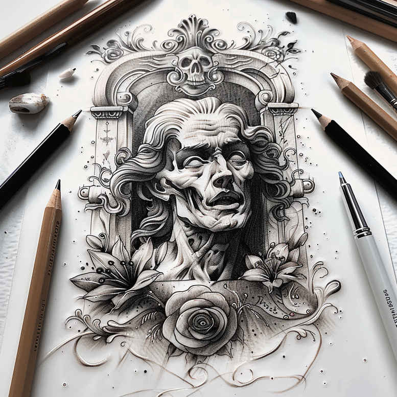 This AI-generated tattoo project concept presents a dark, high-contrast black and grey portrait designed for ink on skin. The central image is a gaunt, stoic face wearing a crown, set within an ornate frame whose scrollwork and floral accents create a dramatic, cohesive boundary. Surrounding roses and floral motifs weave through the frame, giving a sense of life and endurance amid shadow, while fine line details and smooth gray washes build depth without color. The crown introduces authority and memory, and its angular points echo elements in the filigree to reinforce a timeless, ceremonial mood. The surrounding frame acts as a strong architectural container, enabling the piece to function as a compelling standalone tattoo or as the anchor for a larger sleeve or back composition. This concept reflects a study approach – an AI-generated tattoo project crafted as a viable option for clients seeking meaningful tattoos with black and grey realism. From a technical perspective, the piece emphasizes controlled line weight, deliberate shading, and subtle gradient work to achieve lifelike texture on skin; the roses provide soft contrast that balances the stern portrait. If adapted to a Japanese style tattoo or a rose tattoo design, the linework can flow into lotus flower tattoos, infinity tattoos, tribal tattoos, or other flower tattoos for a cohesive narrative. The pattern-rich frame offers rhythm and potential for pattern integration in a larger body art project, while remaining suitable for a smaller focal tattoo as well. As a cover-up candidate, the dense shading and strong silhouette provide a robust canvas for concealing older marks, and the high-contrast composition can be tuned to suit different skin tones. This AI-generated concept demonstrates how algorithmic tattoo design can yield premium, magazine-ready ink ideas that resonate with fans of fine line tattoo, black and grey realism, and iconic flower tattoos, with meaningful symbolism and clear opportunities for customization and storytelling.