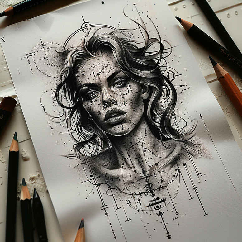 This AI-generated tattoo project concept presents a dark portrait rendered with tonal grays and crisp line work. The central figure is a woman, her face captured in a somber gaze, with windswept hair that threads through the composition. The image sits on a sheet of paper, and the surrounding pencil marks and ink splatters create a kinetic frame that suggests motion, texture, and the hand of the artist. The technique leans on a fine line tattoo foundation to articulate delicate facial contours, while broad shading adds weight to the jaw, cheek, and eye sockets, producing a high-contrast look that translates well to black and grey tattooing. Because the piece is heavy in dark values, it becomes an excellent candidate for a cover-up: the dense blacks can mask existing ink, while the composition provides a strong new focal point for the wearer. Key visible elements include the face as the primary motif, hair providing texture and energy, the paper surface as context, and the pencil strokes plus splatters that frame and energize the portrait. The presence of pattern-like splatters introduces a contemporary edge that can be further developed into decorative motifs, from subtle floral accents to Japanese style tattoo aesthetics, should a client desire additional meaning or embellishment. The symbolism of a portrait subject—merging resilience, mystery, and personal narrative—lends itself to meaningful tattoos, as does the potential to pair the design with elements like a lotus flower tattoo, infinity tattoo, or rose tattoo design in a custom tattoo design. Technically, the piece suits a small to medium-sized placement with refined line work, or a larger black and grey rendition that emphasizes negative space and bold shading. The concept harmonizes realism and abstraction, offering room for stylistic tweaks while preserving legibility on skin. This project is an AI-generated tattoo concept intended to inspire, and readers will note its relevance to tattoo design, meaningful tattoos, fine line tattoo, small tattoos, flower tattoos, and Japanese style tattoo influences, all while staying faithful to ink longevity and body art.