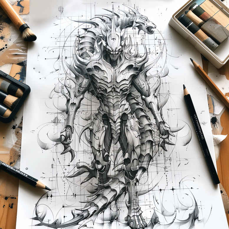 An AI-generated tattoo project concept centered on a dark, highly detailed dragon figure drawn in black and grey line work. The central silhouette combines mythic dragon energy with warrior-like armor, sweeping wings, and intricate ornamental patterns that create a dense, cohesive design suitable for refinement into a tattoo. The composition rests on a sheet of paper, with graphite pencils and erasers visible at the edges, underscoring that this is a design draft intended for inking. The technique emphasizes fine line precision, crisp containment of negative space, and careful shading to achieve strong contrast on skin. Symbolically, the dragon embodies strength, protection, and metamorphosis, while the winged motif alludes to freedom and ascent; the armor elements introduce a ceremonial, battle-ready mood that complements bold black and grey tattoo aesthetics. Given its pattern-rich surface and dense linework, this concept is particularly well-suited as a cover-up design, capable of masking older ink while preserving essential detail through strategic shading and spacing. The piece also nods to Japanese and fantasy influences through flowing energy lines and ornamental motifs, making it adaptable to diverse styles—from a realistic tattoo illustration to a stylized, Japanese-inspired piece. As a complete tattoo concept, it aligns with keywords such as tattoo, tattoo design, meaningful tattoos, fine line tattoo, lotus flower tattoo, infinity tattoo, tribal tattoo, rose tattoo design, small tattoos, flower tattoos, custom tattoo design, Japanese style tattoo, black and grey, realistic tattoo, body art, and ink. While the image remains dark and intense, it is crafted to maximize cover-up potential, ensuring practitioners can tailor shading patterns to conceal prior work while delivering a striking final result. Note that this is an AI-generated tattoo project concept, offered to inspire artists and clients seeking bold, concept-driven body art.