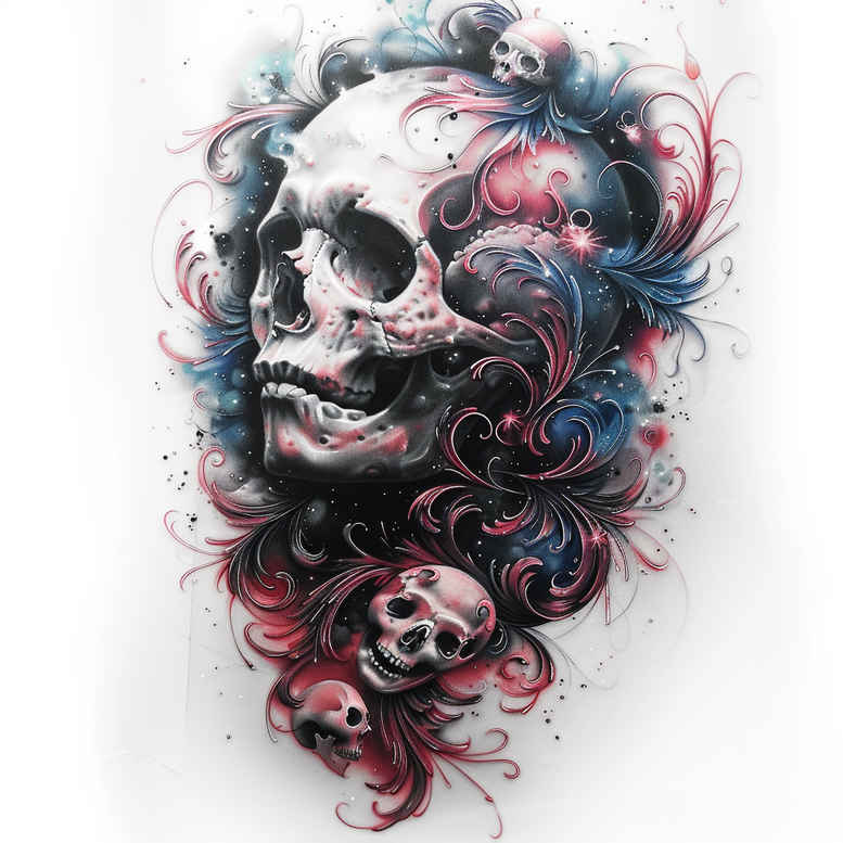 Presented as an AI-generated tattoo project concept, this design centers on a dominant skull rendered in black and grey with seamless shading to create a lifelike bone structure, while smoky, organic wisps weave through the composition in deep black with accents of pink and cobalt blue to add depth and contrast. The piece plays with light and negative space, offering a dramatic focal point on the upper arm, back of the shoulder, or calf, as the smoke acts as a connective motif allowing a skilled artist to extend the design into sleeve work or to integrate existing tattoos. Elements include a main skull, two smaller skull fragments within the smoke, swirling filigree, and soft color pops that avoid overpowering the grayscale base. The style leans toward realistic black and grey with subtle color highlights, suitable for a high-contrast tattoo design, while retaining possibilities for a Japanese-inspired or tribal reinterpretation if desired by the client. For meaningful tattoos, the skull can symbolize mortality and resilience; the smoke suggests fading memories or transformation, while the accent colors inject vitality. This concept can be adapted into fine line tattoo work or larger pieces, and can pair with motifs like lotus flower tattoo or rose tattoo design as a future extension. For those seeking small tattoos to memorialize, the pattern of smoke provides a pathway for a discreet, intimate piece. If the goal is to cover existing ink, this design offers strong coverage potential due to dense shading and overlapping smoke. Note: this is an AI-generated tattoo project concept; consult a licensed tattoo artist to refine lines, scale, and placement, and consider the client’s skin tone and prior work for optimal cover-up results. Keywords: tattoo, tattoo design, meaningful tattoos, fine line tattoo, lotus flower tattoo, infinity tattoo, tribal tattoo, rose tattoo design, small tattoos, flower tattoos, custom tattoo design, Japanese style tattoo, black and grey, realistic tattoo, body art, ink.