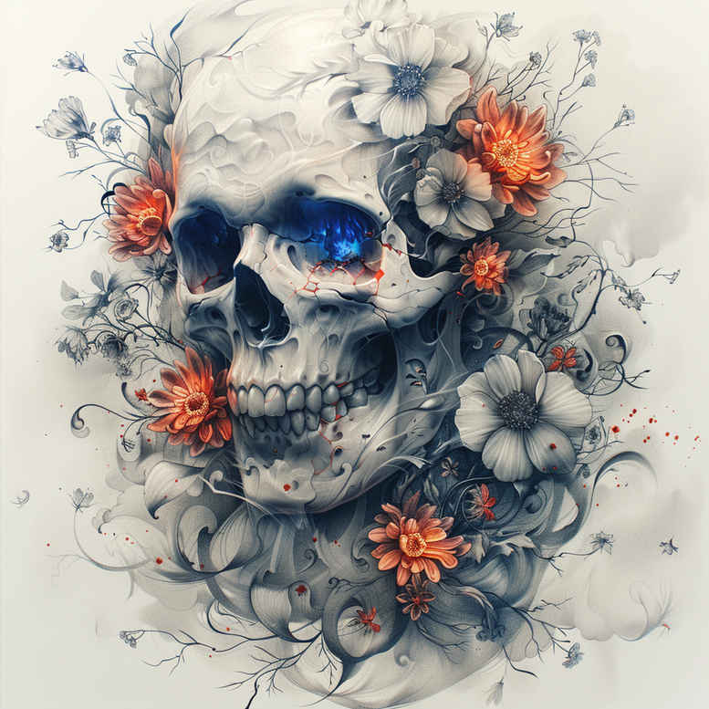 This AI-generated tattoo project concept presents a skull entwined with orange roses and restrained grey foliage, rendered in a loose black and grey watercolor style that blends soft washes with precise linework. The skull is the focal point, bearing a contemplative expression, while the vivid orange roses provide a bold color contrast that anchors the composition and signals a balance between mortality and vitality. Grey leaves and wisps of shading coil around the skull, forming a natural frame that dissolves into misty negative space, making the piece highly suitable as a cover-up design by integrating prior ink into its dark shadows and floral extensions. The technique relies on delicate shading, fine lines, and controlled color accents to preserve the skull’s anatomical clarity while letting the watercolor washes pulse with movement, yielding a tattoo design that feels both realistic and painterly. Symbolically, the skull embodies mortality and resilience, the roses represent beauty, renewal, and passion, while the surrounding leaves evoke growth and continuity; together they suggest a personal narrative of overcoming past experiences. The overall composition suits a vertical placement on the upper arm, shoulder blade, or thigh, with room to extend into a larger work such as a sleeve or back piece, while remaining readable at smaller scales as a meaningful tattoo. For pigment strategy, the black-and-grey base ensures timeless longevity, with selective orange accents highlighting the floral elements; the result is adaptable to full color or kept monochrome as requested, aligning with trends in fine line tattoo and realistic tattoo aesthetics. The piece also nods to classic rose tattoo design tropes and botanical motifs found in flower tattoos, providing a versatile foundation for a custom tattoo design that can evolve with the wearer’s story. Finally, as AI-generated tattoo project concepts, designs like this illustrate how modern tools can produce versatile, cover-up-capable body art with room for customization and future expansion, while remaining suitable for ink under various skin tones.