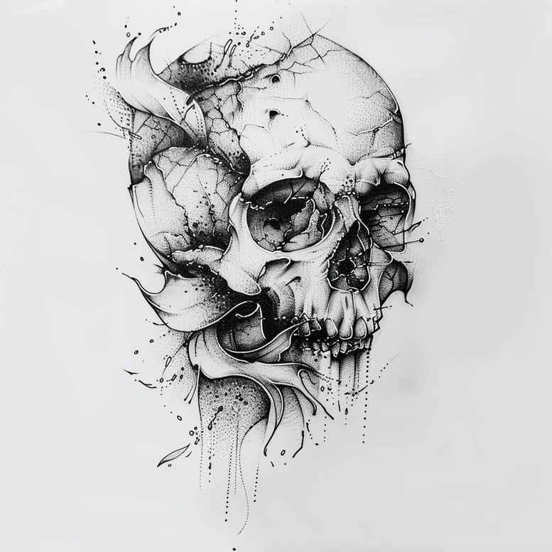 AI-generated tattoo project concept, this dark skull portrait in black and grey embodies a practical cover-up solution with grayscale realism and graphic ink texture. The composition centers on a skull rendered in fine line technique, with careful cross-hatching and stippling to create depth while maintaining readability on curved skin. Subtle drips and a loose, sketch-like halo dissolve into negative space, producing a dynamic yet wearable image that can elegantly conceal prior ink beneath. The design leans on grayscale realism, emphasizing bone texture, shadow, and soft tissue while preserving a bold silhouette suitable for a cover-up, yet refined enough to function as a standalone statement. In practice, this tattoo design provides a versatile canvass for placements from the upper arm to the back, working across various skin tones by balancing dense inky regions with lighter transitions. The skull’s expression reads contemplative rather than menacing, inviting personal interpretation and making it a meaningful tattoo choice for themes of mortality, resilience, or transformation. Technique-wise, controlled line weight and layered shading create depth without excessive density, ensuring longevity and potential for touch-ups. Because the piece relies on grayscale nuance rather than color, it offers forgiving cover-up potential where underlying color or faded lines can be camouflaged by the grayscale values. The shading includes pattern-like cross-hatching to add texture and interest, while the overall composition remains crisp and legible on demand. This is a genuine black and grey tattoo approach that aligns with modern tattoo design trends and can be customized further with motifs such as lotus flower tattoo or infinity tattoo symbols if desired. As an AI-generated tattoo project, it serves as a robust reference for artists and clients seeking a high-contrast skull motif that remains legible and impactful on different body areas, with a clear path toward a successful cover-up if needed.
