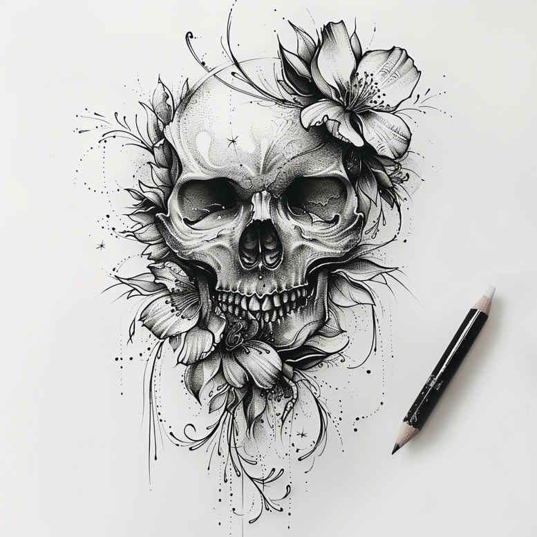 Presented here is a skull and flower composition rendered in black and grey with fine-line precision, conceived as a flexible tattoo concept and an AI-generated tattoo project. The central skull anchors the design with subtle cross-hatching and negative shading that create depth without overpowering the surrounding botanical detail. Blooming flowers wrap the skull’s jaw and temples, their petals and leaves interlacing in a natural pattern that reads well on forearms, calves, or shoulders. The pencil-like sketch lines visible in this presentation hint at an adjustable stencil and a clean translation to skin, allowing a tattoo artist to refine or modify proportions during a custom tattoo design session. Although dark in overall impression, the piece maintains clarity in its line work, with stippling used to imply texture in the bone and soft gradient shading to separate foreground from background. This concept embraces the fine-line tattoo aesthetic while offering the dramatic contrast of black and grey ink, making it suitable for a realistic tattoo interpretation or a more graphic, Japanese-style adaptation for color-free body art. The symbolism blends mortality with beauty, a common theme in meaningful tattoos, where the skull evokes remembrance and the flowers signify renewal. For those seeking a small tattoo or a larger piece, the design scales gracefully, preserving legibility of the skull’s features and the delicacy of the petals. As a cover-up candidate, the dark shading can mask existing ink while the floral elements provide camouflage and a fresh focal point, demonstrating how a thoughtful composition can transform legacy ink into a contemporary gem. This is an AI-generated tattoo project that demonstrates versatile composition, strong anatomy, and the potential for customization across body placements, ensuring a refined, enduring result.
