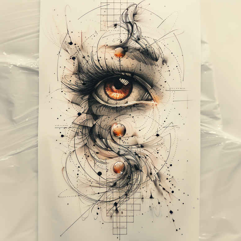 This AI-generated tattoo project presents an eye-centered geometric composition crafted as a versatile cover-up concept. The centerpiece is a lifelike eye rendered in black and grey through fine line tattoo technique, its iris catching a subtle orange accent that draws the eye while remaining versatile for concealment tasks. Surrounding the eye, an intricate lattice of lines, circles, and splashes forms a pattern-rich aura that reads as both contemporary tattoo design and homage to traditional geometry. The interplay of crisp contours and softly graded shading creates depth on the skin, yielding a realistic tattoo effect that remains bright and legible over time. Symbolically, the eye represents perception and insight, while the concentric circles imply cycles and infinity; the splatter and swirl motifs evoke movement, life, and transformation. The design is scalable, making it suitable for small tattoos on the wrist or behind the ear, or expanded into larger body art such as a forearm or back piece. For those seeking meaningful tattoos, this concept blends Japanese style sensibilities with modern clean lines, offering a sophisticated path for a custom tattoo design that balances realism with abstract geometry. Because the piece relies on black and grey shading, it serves as an excellent candidate for cover-up work, concealing darker ink beneath its layered linework and pattern. This is an AI-generated tattoo project, illustrating how digital concepts can translate into tangible body art. In terms of SEO, the design aligns with keywords like tattoo, tattoo design, meaningful tattoos, fine line tattoo, lotus flower tattoo, infinity tattoo, tribal tattoo, rose tattoo design, small tattoos, flower tattoos, custom tattoo design, Japanese style tattoo, black and grey, realistic tattoo, body art, and ink.