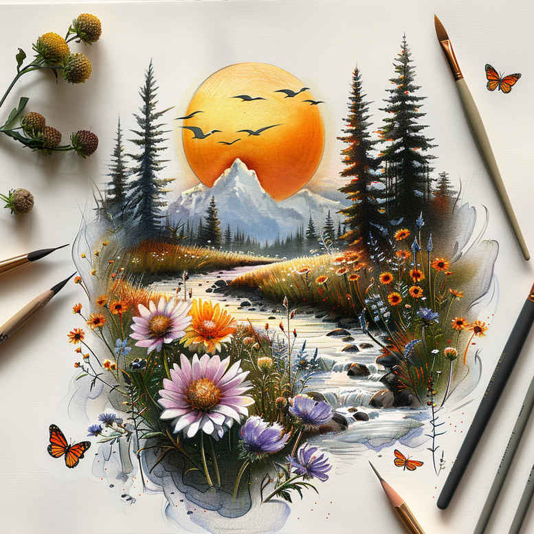 An AI-generated tattoo project concept presenting a sunlit nature landscape rendered in a watercolor-inspired palette. The scene features a radiant sun lifting over a pine forest and rugged mountains, a calm river threading through a meadow of wildflowers, and delicate butterflies hovering above a cluster of daisies. The composition balances soft washes with fine line detail to achieve a dreamlike realism suitable for both small tattoos and larger pieces. The sun adds warmth and life, while the mountains offer a dramatic horizon and the river adds flow that guides the eye from foreground flora to distant scenery. The floral cluster in the foreground provides bold color contrasts—pinks, purples, yellows, and whites—set against greens and blues to create depth and movement. This design can be adapted in size and line density to suit black and grey or full-color tattoo styles, making it a versatile tattoo design for meaningful tattoos, flower tattoos, and landscape-inspired body art. For symbolic meaning, the sun signifies vitality, the river represents a journey, flowers symbolize growth, and butterflies stand for metamorphosis, all wrapped in a natural scene that nods to Japanese style tattoo sensibilities and modern ink techniques. While this is a concept rather than a finished commission, it translates well into a realistic tattoo rendering on skin, preserving depth, shading, and texture in ink. AI origins are acknowledged to remind viewers this concept originates from AI-generated tattoo projects, intended to inspire artists and clients looking for custom tattoo design ideas.