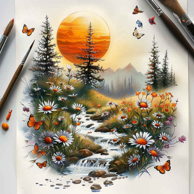 AI-generated tattoo project concept presented as a watercolor landscape that translates well into a tattoo design. The composition centers on a warm sun low in the sky, a meadow of daisies in the foreground, a ribbon of stream curling through grasses, and scattered evergreen trees framing the scene. The piece uses soft washes of color to mimic watercolor painting, with subtle granulation and gentle color bleeding at the edges to mimic skin absorption. Key elements include the sun as a symbol of vitality, daisies representing innocence and renewal, and the stream signifying flow and journey. The image reads as a natural, tranquil scene that can be adapted into multiple tattoo formats—from small, intimate pieces on the wrist or ankle to larger back or sleeve-length works. The approach remains faithful to nature while embracing the delicate line work characteristic of fine line tattoos, and the painterly quality could inspire a high-contrast black and grey version if preferred. For a Japanese style interpretation, the meadow can be threaded with stylized waves or bamboo motifs that tie the scene to a broader body art narrative, while a rose tattoo design motif could be introduced as a focal secondary element if desired. This concept also dovetails with trends in flower tattoos and small tattoos that celebrate outdoor motifs, offering versatility for a custom tattoo design. The piece is presented here as an AI-generated tattoo project, illustrating how watercolor techniques translate to skin and providing a starting point for a meaningful tattoo. If used as a cover-up, the soft gradients and overlapping elements can help blend an old scar or dark area, though the current concept emphasizes luminous color, light lines, and natural shading that can be adapted for a fresh start. In terms style, the design stays within the broad umbrella of tattoo art, it can be rendered as a fine line tattoo, a black and grey piece, or a vivid full-color work. The botanical theme invites further exploration into lotus flower tattoo, flower tattoos, and small tattoos as a means to carry personal symbols of growth, resilience, and serenity, including infinity tattoo motifs if desired. In short, this artwork offers a flexible starting point for a meaningful tattoo design that respects tradition while embracing contemporary ink techniques.