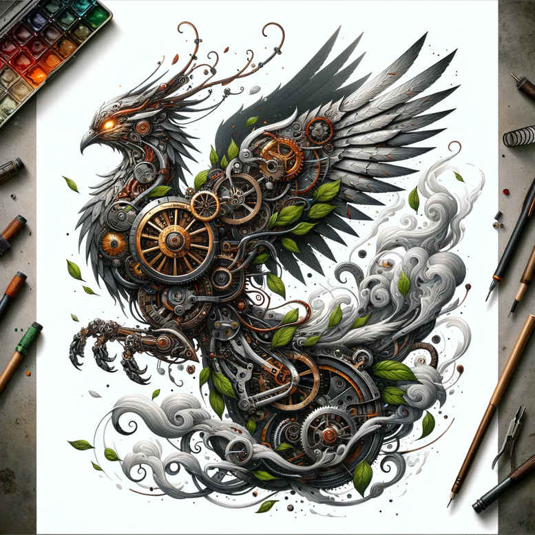 This black and grey steampunk dragon tattoo design blends a powerful draconic silhouette with clockwork anatomy: gears, pistons, and chained segments intertwine with scaled plates along a sinewy frame. Rendered as an AI-generated tattoo project, the concept emphasizes bold linework, deep shading, and nuanced transitions between metal and flesh, creating a realistic tattoo feel while preserving artistic flair. The wings spread in dynamic motion, each feather replaced by iron slats and cog accents, and smoke swirls around the form to suggest steam and energy. The central body carries exposed gears under rib-like armor, a tail coiled with chain links, and a head crowned by a gear-driven crest; this fusion of organic and mechanical elements makes the piece visually dense and highly contrasted. Designed with cover-up in mind, the composition uses expansive dark mass and strategic negative space to mask older tattoos or scars, while the black and grey palette ensures longevity and readability across skin tones. Symbolically, the dragon embodies power, resilience, and metamorphosis, while the industrial motifs speak to invention, precision, and enduring craft—ideal for meaningful tattoos or a personal myth told through ink. The piece adapts well to large canvases such as back, sleeve, or chest panels, with potential for smaller iterations that retain impact through strong contrast and meticulous detailing. In terms of style, the design fuses black and grey realism with steampunk pattern motifs, making it a striking, cover-up-friendly choice and a robust addition to any tattoo design portfolio. Keywords to consider include tattoo, tattoo design, meaningful tattoos, black and grey, realistic tattoo, custom tattoo design, ink; the concept leans into pattern-rich graphic devices through cogwork, and can inspire fine line tattoo or larger body art projects while remaining suitable for a compelling cover-up.