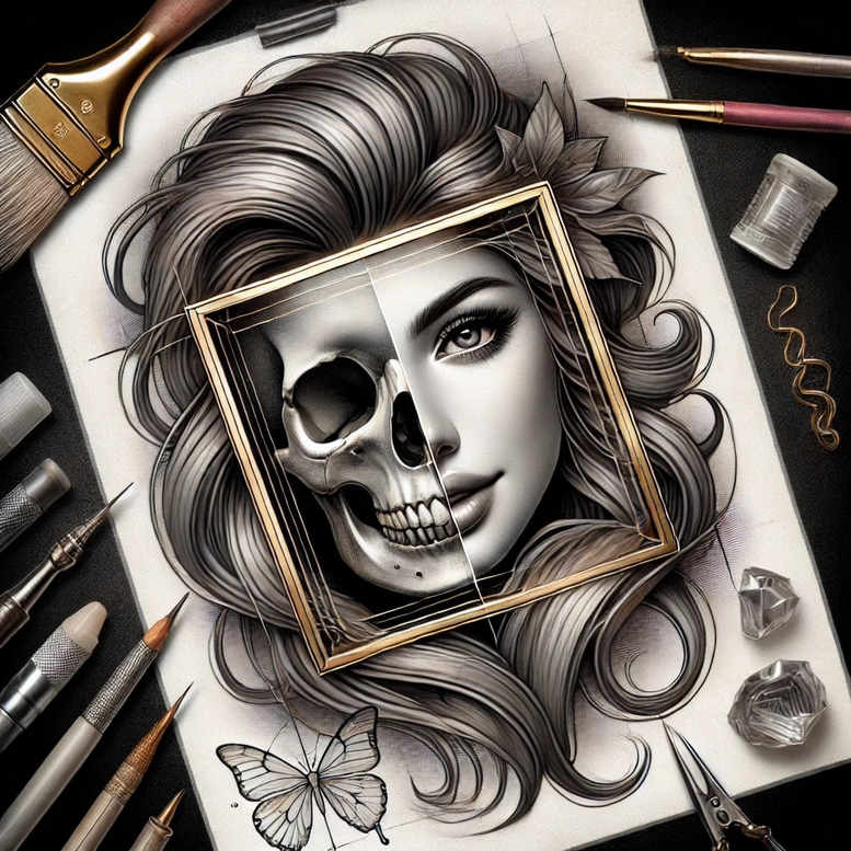 AI-generated tattoo project concept: a dark, high-contrast portrait-skull study framed as a compact composition suitable for cover-up work. The subject’s face is rendered with careful shading to achieve realism, while the opposite side reveals a skull motif that transitions into the same portrait, creating a haunting duality. The square frame acts as a visual anchor, producing a tattoo-friendly silhouette ideal for forearm, chest, or calf placement. Surrounding tools—pencils, brushes, an ink bottle—and a delicate butterfly establish a studio-like context that reinforces the design’s craft-forward sensibility. The black and grey palette emphasizes value, depth, and texture, enabling smooth transitions from fine line work to solid shading essential for durable ink. This concept can be adapted into a small-to-medium piece or expanded into a larger sleeve variation, with careful attention to line weight, shading density, and skin tone. Symbolically, the skull hints at mortality and transformation, while the portrait alludes to memory and identity; the frame suggests focus and containment, a motif common to portrait traditions in both Japanese and Western tattoo art. The butterfly introduces metamorphosis and balance, offering contrast to the darker themes. For clients seeking a meaningful tattoo design with a realist edge, this study provides a versatile template for cover-up solutions, particularly where prior dark ink or heavy lines need concealment. As an AI-generated tattoo project concept, it invites collaboration with an experienced tattoo artist to refine line work, gradient shading, and placement to suit individual anatomy and preferences. In sum, this portrait-skull study is versatile, cover-up friendly, and grounded in classic tattoo design principles, ready to be translated into a bespoke piece that preserves memory while embracing change, making it a strong choice for meaningful tattoos, black and grey ink, and refined body art.