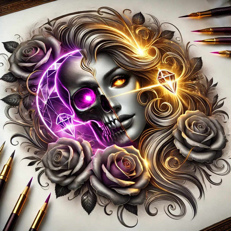 AI-generated tattoo project concept presented here centers on a grayscale portrait of a woman’s face, rendered with nuanced shading to capture light and shadow in a realistic tattoo style. The composition fuses a split-tone energy motif with floral framing: on the left, a violet electric aura that resembles crackling lightning; on the right, a warm golden glow that highlights the contours of the cheek and brow. Surrounding the face are roses in muted pinks and purples, their petals curling into the hair which is drawn in flowing, intricate lines that guide the viewer toward the centerpiece. Subtle linework and gradients create depth, enabling this design to function as both a bold statement and a refined piece suitable for fine line tattoo work, black and grey realism, or as a foundation for a rose tattoo design. The overall mood blends dark, moody shadows with selective color, offering a versatile base for a cover-up if needed, while still allowing bright accents for a personalized tattoo design. Symbolically, the image juxtaposes darkness and light, suggesting transformation, resilience, and growth; the roses symbolize beauty evolving from struggle, while the electric energy hints at sudden change or inspiration. As a meaningful tattoos concept, it can be adapted to a forearm, shoulder, or back piece; it also sits well within Japanese style tattoo or modern realistic approaches, depending on the artist’s technique. This is an AI-generated tattoo project intended as a starting point for a custom tattoo design, inviting clients to tailor color, shading, and line weight for their own ink. In all its forms, the artwork is crafted to be both a standalone image and a meaningful tattoo concept, with ink-ready lines that translate well to small tattoos or larger floral portraits, and the dual-tone lighting provides a dynamic look that remains timeless in body art and ink. If the final piece is applied in a very dark area or used to cover prior work, the dark shading and negative space can effectively mask previous tattoos, reinforcing its suitability as a cover-up. Potential expansions could include lotus flower tattoo motifs, infinity tattoo symbolism, tribal tattoo accents, or a bold portrait extension, all while staying true to the core rose and lightning energy theme.