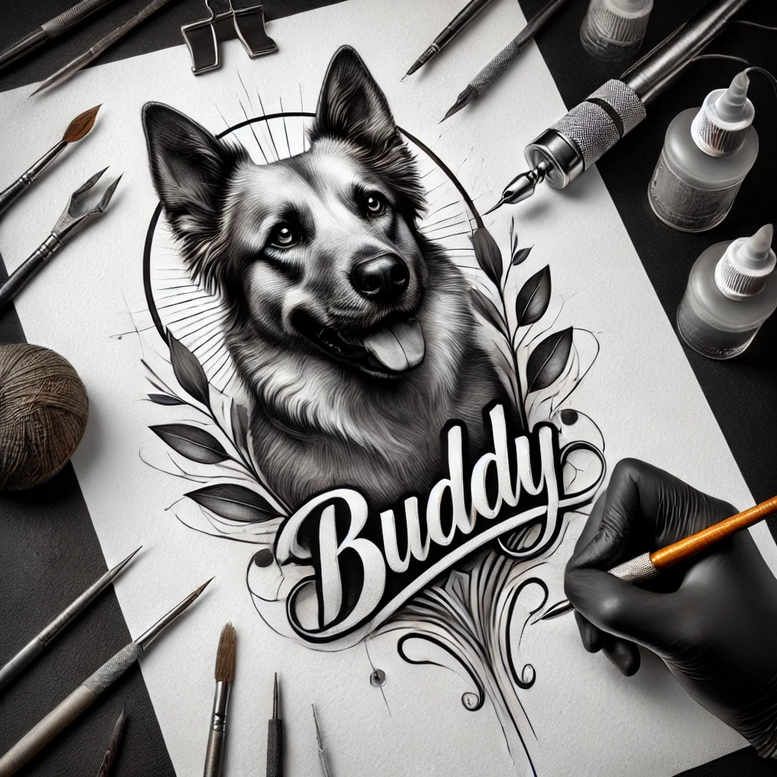 This AI-generated tattoo project concept centers on a lifelike dog portrait framed by a laurel wreath, rendered in black and grey with refined fine line technique to capture fur texture and subtle shading. The dog’s expression communicates loyalty and companionship, while the laurel circle lends a timeless sense of honor. The name Buddy appears in script, anchoring the focal point and personalizing the piece. The composition sits as a studio concept, with visible drawing tools—pencils, an ink bottle, brushes, and sheets of paper—to emphasize its nature as a design exploration rather than a finished tattoo. Technically, the design relies on crisp outlines, controlled grey washes, and light stippling to create depth at small to medium scales, making it suitable for placements such as forearm, shoulder, or chest. The grayscale ink aesthetic reinforces realism and durability, while the motif aligns with meaningful tattoos and black and grey realism. This concept lends itself to a custom tattoo design process, inviting adjustments in line weight, shading intensity, and size. Symbolically, the dog stands for loyalty and memory, the laurel for victory or tribute, and together they form a dignified portrait that can serve as a stand-alone piece or integrate with additional floral or iconographic elements in a larger body art project. As an exploratory AI-generated tattoo project, it offers a solid foundation for clients seeking a refined, classic look that remains versatile across styles and placements. This combination translates well to small, intimate tattoos or feature pieces, while the laurel adds a timeless motif that remains legible as the skin ages.