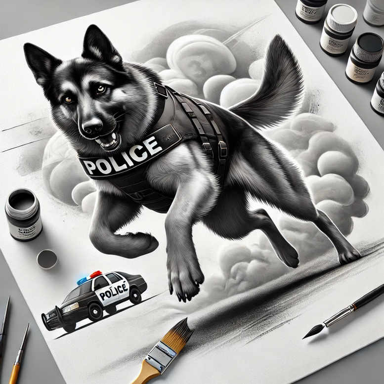 This tattoo design concept presents a police K9 in forward motion, rendered in black and grey realism on a drawing sheet. The central figure is a muscular shepherd-like dog, depicted with crisp linework and smooth shading to capture muscle tension, fur texture, and an alert, protective posture. The harness bears POLICE, while a stylized badge and a suggestion of a police car glimpse the context of law enforcement, all anchored by a studio-page sketch that includes circles resembling palettes, pencils, and brushes. The composition blends animal portraiture with artisanal tools to create a design study that invites refinement into a final tattoo concept. Grayscale values are employed to maximize depth, contrast, and texture—from the dark fur to metallic accents—ensuring legibility across placements. The juxtaposition of form and craft emphasizes symbolism of loyalty, guardianship, and duty, making this tattoo design meaningful for clients seeking tribute to service or personal strength. Its versatility supports both small tattoos and larger canvases, with potential for fine-line precision or a bolder, high-contrast approach depending on placement. As an AI-generated tattoo project concept, it demonstrates how grayscale shading and line weight influence the final ink, and it offers good cover-up potential for darker baselines given its strong silhouette. This description embeds SEO keywords such as tattoo, tattoo design, meaningful tattoos, fine line tattoo, lotus flower tattoo, infinity tattoo, tribal tattoo, rose tattoo design, small tattoos, flower tattoos, custom tattoo design, Japanese style tattoo, black and grey, realistic tattoo, body art, ink, to situate the concept within contemporary body art discourse.