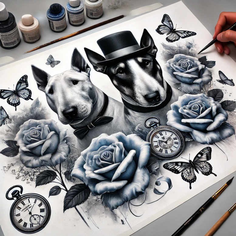 AI-generated tattoo project concept, presented as a highly detailed black and grey, fine-line composition suitable for a range of placements. The central image is a dog portrait rendered in crisp linework with subtle shading to capture fur texture and a calm gaze, while a vintage top hat adds character and formality. Surrounding elements include stylized roses with layered petals and a cool blue tint in the finished color plan (rendered here in grayscale for clarity), delicate butterflies mid-flight, and pocket watches with open faces that reveal clockwork detail. The juxtaposition of organic floral shapes and precise mechanical motifs creates a contrast between life, memory, and time, a theme reinforced by the watch faces and subtle chains that tie the composition together. The piece relies on a restrained palette of black ink on skin, using varied line weights to differentiate focal points from background motifs, with smooth shading to suggest depth without heavy saturation. The result is a cohesive design that reads as a single tattoo design yet offers enough versatility for customization: adjust the size to fit forearm, calf, or shoulder; expand the bouquet for a sleeve; or replace moment-in-time watches with a personal symbol while maintaining the same structural rhythm. Because the image is heavily dark in places and features bold silhouettes paired with fine details, it is especially well suited for a cover-up scenario, where strong negative space and layering can successfully conceal prior ink beneath new imagery. As an AI-generated tattoo project, it exemplifies how algorithmic concept generation can inspire meaningful tattoos that balance narrative symbolism (loyalty from the dog, love from the roses, time from the watches) with practical tattoo design considerations such as line density, readability at small scales, and longevity of gray tones. Keywords: tattoo, tattoo design, meaningful tattoos, fine line tattoo, rose tattoo design, small tattoos, flower tattoos, custom tattoo design, black and grey, realistic tattoo, body art, ink, timepiece, memory, loyalty, transformation.