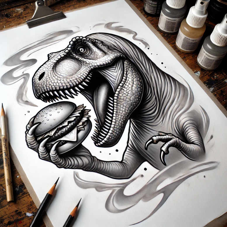 This description accompanies an AI-generated tattoo project featuring a bold black-and-grey dinosaur motif. Rendered as a dynamic sketch on paper, the composition centers on a snarling dinosaur with jaws agape, gripping a rounded orb that suggests mystery and cyclical strength. The piece relies on dense linework, cross-hatching, and careful tonal transitions to create depth and motion, while preserving the crisp contrast essential for a lasting tattoo. Visible elements include the paper surface beneath the creature and the surrounding studio tools such as pencils and paint bottles, hinting at the iterative design process that leads from study to ink. The color palette is strictly black and grey, exploiting variations in line weight and shading to convey texture on scales, teeth, and the orb’s reflective surface. The overall aesthetic leans toward realistic tattoo influences with illustrative flair, compatible with fine-line and traditional shading approaches, and it nods to Japanese-inspired line work and bold negative space. As a tattoo design concept, it communicates themes of primal power and ancient enigma, offering a distinctive option for a statement tattoo or an effective cover-up solution when existing marks need concealment. The project also reflects contemporary AI-assisted ideation in body art, producing a structured concept that can be refined by an artist into ink. Key elements apparent in the design include dinosaur, orb, paper, pencils, paint bottles, all rendered in black and grey with strong contrast and fluid motion. In terms of tagging for search optimization, the description includes terms such as tattoo, tattoo design, meaningful tattoos, fine line tattoo, lotus flower tattoo, infinity tattoo, tribal tattoo, rose tattoo design, small tattoos, flower tattoos, custom tattoo design, Japanese style tattoo, black and grey, realistic tattoo, body art, ink. If this piece is applied as a cover-up, its dense shading and solid dark areas make it especially suitable for concealing prior markings, with room for adjustments to linework and contouring to fit individual anatomy.