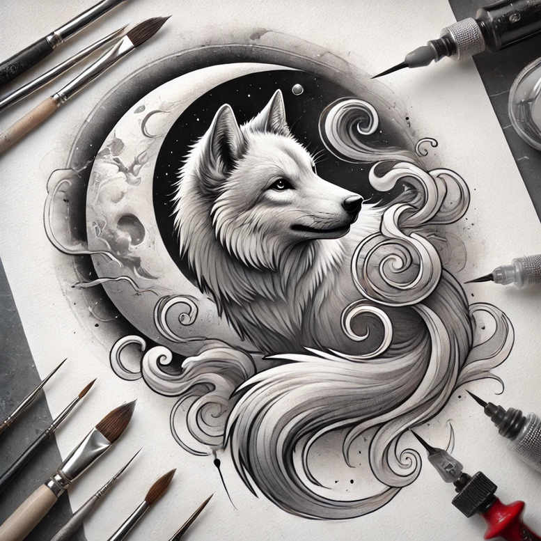 This piece presents a grayscale wolf head anchored by a crescent moon and framed by curling swirls, conceived as an AI-generated tattoo project to illustrate a refined concept for clients and studios. The central wolf symbolizes guardianship and instinct, while the moon adds nocturnal mystery and a sense of fate. The surrounding swirls function as ornamental patterning, weaving wind and water motifs into a cohesive composition that remains legible as a small tattoo or expands into a larger piece. Rendered in black and grey, the design relies on contrasts and subtle tonal shifts to suggest fur texture, lunar glow, and depth, with fine line work defining edges and soft gradients building volume. The pattern-rich backdrop offers strong visual rhythm while preserving negative space for readability on smaller canvases. Technically, the piece explores balance between solid black fills and delicate lines, using layering, cross-hatching, and smooth shading to achieve a three-dimensional feel without crowding the skin. The concept is deliberately versatile: it can function as a stand-alone tattoo design or be extended with Japanese style influences, tribal motifs, or floral elements depending on client preference. As a narrative representation, it invites multiple readings—from a guardian spirit to a nocturnal compass—affirming meaningful tattoos that resonate with personal journeys. Given its dark elements, this composition also serves as an excellent cover-up template for concealing prior work. This artwork also serves as a practical guide for studios exploring grayscale shading workflows, stencil alignment on curved surfaces, and ink layering strategies for different skin tones. It invites client dialogue on personal meaning, enabling the tattoo to be tuned for size, placement, and cultural resonance. Artists can adapt the flow with additional elements such as cherry blossoms or Japanese wave motifs to suit preferences while preserving the core silhouette. The piece emphasizes readability through negative space, ensuring the moon halo remains legible as ink settles, and the fur detail does not blur with time. For clients seeking meaningful tattoos, the design balances mythic symbolism with technical finesse, aligning with trends in black and grey realism, fine line technique, and custom tattoo design. This is an AI-generated tattoo project intended to illustrate a market-ready concept for collaboration between clients and studios.