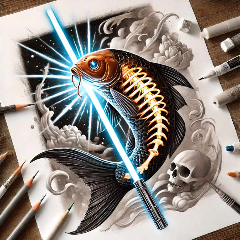 This color tattoo design centers on a bold koi fish, its orange and black scales vibrant against a midnight backdrop. A luminous electric blue blade slices through the composition, giving a modern edge to a traditional Japanese style tattoo and creating a strong focal point for a cover-up-ready tattoo design. Surrounding skulls and curling smoke frame the scene, lending a moody, cinematic atmosphere that nods to graphic motifs while remaining legible on skin. The koi’s scales form a repeating pattern that adds texture and rhythm, while the interplay of crisp linework and soft shading yields depth that works in both black and grey realism and full-color ink. Rendered with precise layering, the piece emphasizes movement and flow, achievable in fine line tattoo technique or bolder styles, making it adaptable for small tattoos or larger back- or sleeve-scale work. This concept resonates as meaningful tattoos, balancing resilience and transformation with aquatic symbolism common in lotus flower tattoo and rose tattoo design traditions, and it nods toward infinity tattoo and tribal tattoo aesthetics for cross-pollination in future projects. The design is a versatile custom tattoo design, capable of sustaining high-contrast color or subtle grayscale, ensuring longevity and clarity across skin tones; its graphic composition also supports cover-up strategies by leveraging solid silhouettes to mask existing markings. For collectors, it offers a vivid fusion of Japanese style, color dynamics, and symbolic meaning—an ideal platform for ink enthusiasts seeking unique flower tattoos, small tattoos, or larger body art explorations, all while highlighting the core keywords tattoo, ink, and tattoo design. This AI-generated tattoo project embraces the modern art of ink and serves as a reference for a cover-up-ready piece.