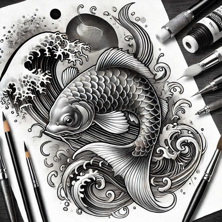 This koi fish tattoo design presents a classic Japanese-inspired composition rendered in black and grey. The central koi is depicted with a flowing tail and intricate scale work, swimming among curling waves that convey movement and resilience. The piece relies on bold lines and smooth gray washes rather than color, achieving a refined fine line tattoo aesthetic that reads clearly on skin while delivering rich texture. The surrounding negative space and deliberate line variation create balance, making the design suitable for a cover-up when applied with proper technique, thanks to substantial dark areas that can help obscure prior ink or scarring. The motifs symbolize perseverance, transformation, and harmony, with the koi as a traditional emblem of strength in Japanese tattoo art, and the waves reinforcing the idea of adaptability in the face of change. This concept can be scaled from small placements to larger panels for the shoulder or back, while preserving a black and grey palette and a distinctly Japanese style. In terms of technique, clean outlines, crisp contrast, and graded shading produce a durable, timeless image in ink, with emphasis on texture in the koi scales and wave crests. For clients seeking meaningful tattoos, this design fits among small tattoos or more ambitious body art projects, offering a versatile starting point for custom tattoo design discussions. AI-generated tattoo projects like this are intended as creative briefs to guide commissioning, inviting personalization of fin shape, wave rhythm, and scale pattern. When considering cover-up potential, the thick darkness and strong silhouettes can be leveraged to mask existing tattoos, with placement and skin tone considerations guiding the final result. Ultimately, this koi fish design embodies the enduring appeal of black and grey realism, aligning with both traditional motifs and contemporary tattoo aesthetics, and it remains a flexible template for ink lovers seeking meaningful tattoo design.
