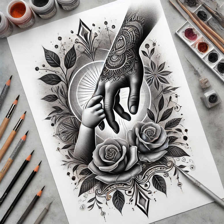 AI-generated tattoo project concept exploring a composed scene of a hand entwined with a mandala motif, a blooming rose, and curling leaves rendered in black and grey. The central hand emerges with stylized shading that blends smooth gradient tones and precise linework to create a tactile, almost sculptural effect. A circular mandala sits behind the palm as a radial anchor, its geometric petals guiding the gaze inward while the rose at the base provides organic counterpoint. The leaves weave around the composition, creating negative space and movement that unify the elements into a cohesive design suitable for forearm or back of the hand applications. Although the mood remains monochrome, the interplay of deep blacks, midtones, and crisp highlights yields a dramatic contrast that reads clearly from a distance and up close. This tattoo design concept is deliberately adaptable: it can be executed as a bold black and grey piece with strong, graphic lines or refined into a finer linework study for a more delicate effect. The pattern-centric backdrop of the mandala offers built-in symmetry that can be extended into sleeve layouts, while the rose introduces classic symbolism of beauty, resilience, and renewal in line with meaningful tattoos. As a cover-up candidate, the heavy shading and layered geometry make it well-suited to conceal older tattoos while providing a fresh narrative; this aligns with ongoing trends toward cover-up-ready designs in modern body art. This AI-generated tattoo project concept also serves as inspiration for designers seeking to blend Japanese style motifs with Western floral realism, yielding a versatile design that can be reinterpreted for different skin tones and sizes.