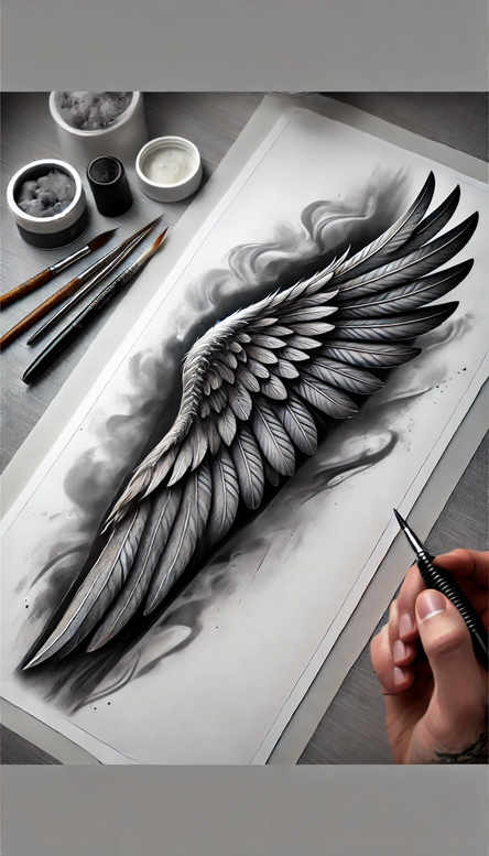 This image presents a meticulous wing tattoo design study rendered in black and grey on a sheet of sketch paper. The piece showcases a dense, layered feather composition with fine line work and subtle gradations of tone that give the plumage a lifelike movement. The surrounding studio tools—a pencil, a small ink pot, and the artist’s hand—frame the drawing, grounding it in traditional draftsmanship even as the project exists as a potential tattoo concept. Conceptually, the wing motif speaks to themes of ascent, protection, and freedom, while the feather arrangement allows for natural expansion along a limb if translated into a tattoo design. The rendering emphasizes feather anatomy, with careful attention to rachis, vane, and barbs, allowing a tattoo artist to reproduce the texture with precision. The black and grey palette reinforces tonal depth without color, making this a strong candidate for a realistic tattoo or fine line style, suitable for body art that leans toward subtle shading. As an AI-generated tattoo project, this concept demonstrates how digital ideation can merge with classic drawing discipline to produce adaptable tattoo designs. For clients seeking small tattoos or larger sleeve planning, the wing motif can be scaled and arranged to suit personal symbolism, from a solitary feather to a broader wing spanning the forearm or back. In terms of technique, the piece reads like a high-contrast pencil study, with crisp line work and smooth tonal transitions that can translate into precise linework or shaded gradients on skin. The repeating feather pattern provides a rhythm that can be echoed in Japanese or tribal-inspired adaptations, while keeping the core motif versatile for lotus flower tattoo, infinity tattoo, or even rose tattoo design variants. This approach aligns with contemporary preferences for black and grey realism, but also supports ink options across small tattoos and larger works. Overall, the concept encapsulates timeless symbolism with a modern graphic edge, illustrating why wing-inspired tattoos remain enduring choices for meaningful tattoos, fine line tattoos, and versatile custom tattoo designs.