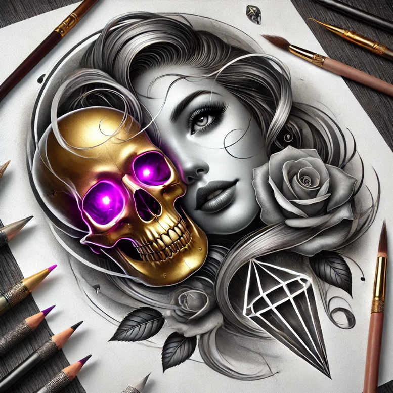 This AI-generated tattoo project presents a cover-up-ready composition that fuses realism with symbolic imagery into a single, cohesive portrait. Central to the design is a lifelike grayscale portrait of a woman, whose calm expression is set among shadows that deepen the mood. To her left, a gold skull with a purple eye adds a dramatic color counterpoint, while a blooming rose anchors the scene with timeless meanings of beauty and resilience. Intersecting these figures, a geometric diamond motif threads through the lower plane, providing a modern counterpoint to the organic forms. Executed in black and grey with selective color on the skull, the piece relies on smooth gradients, crisp line work, and deliberate stippling to produce depth and tactile realism. The skull’s metallic gleam and the eye’s vivid hue are rendered with careful highlights that catch light as if the image were drawn on skin, while the rose achieves a velvety texture through fine feathering and subtle cross-hatching. The overall composition balances negative space and dense shading to maintain readability on larger canvases and to accommodate a realistic tattoo style that remains clear when scaled, making the design suitable for a cover-up. Symbolically, the portrait blends feminine identity with a reminder of impermanence, while the rose embodies growth amid darkness; the geometric diamond motif suggests structure within emotion. Technically, the piece emphasizes fine line tattoo technique, black and grey realism, and high-contrast edges that translate well to skin, with ink saturation tuned for longevity. For studios seeking meaningful tattoos with a contemporary edge, this concept can be adapted to both Japanese and Western sensibilities, with careful attention to line weight, shading, and the interplay of light and shadow. As an AI-generated tattoo project, it foregrounds cover-up feasibility and pattern integration, ensuring the final piece can conceal prior work while presenting a striking motif that reads as flower tattoos and skull-inspired body art.