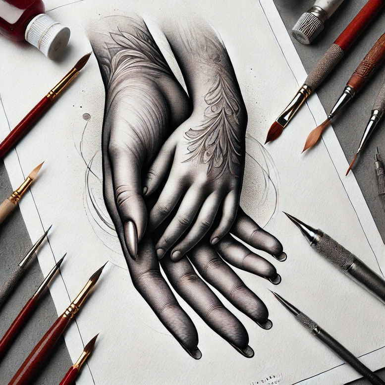 An AI-generated tattoo project shown here presents a study of two hands interlaced in a black and grey palette, drawn as a high-contrast pencil rendering on paper with assorted drawing tools nearby. The composition centers on the realistic anatomy of the hands, with careful attention to knuckles, fingernails, tendons, and skin texture achieved through layered shading, hatching, and smooth gradients that mimic graphite techniques. The ink plan emphasizes bold shadows and delicate mid-tones to create depth and a lifelike presence, while leaving negative space that preserves potential for adaptation in future sessions. As a cover-up friendly concept, the dense dark areas and strong silhouettes offer excellent concealment of underlying tattoos while still allowing new lines to read clearly with age and skin changes. This tattoo design suits black and grey or fine-line approaches and can be scaled for forearm, shoulder, or chest placements, with room to integrate additional motifs such as lotus, infinity, or floral elements if desired. The subject matter—two hands—evokes themes of partnership, trust, and connection, lending itself to meaningful tattoos or personal tributes. From a technical perspective, the work demonstrates precise line control, gradient layering, and edge definition around the fingers and wrists, ensuring legibility on different skin tones and in various lighting. The description frames this as an AI-generated tattoo project concept, appropriate for studios exploring digital-to-tattoo workflows, and emphasizes its role as a solid foundation for a custom tattoo design that can be refined into a lasting body art piece. In summary, this study blends realism with versatility, offering a powerful starting point for a black and grey tattoo that can grow with the wearer while remaining faithful to classic tattoo design principles and ink behavior. Keywords such as rose tattoo design, flower tattoos, small tattoos, Japanese style tattoo, tribal tattoo, realism, black and grey, ink, body art, and custom tattoo design anchor this description for search engines, while highlighting meaningful tattoos and adaptable composition for cover-up-friendly projects.