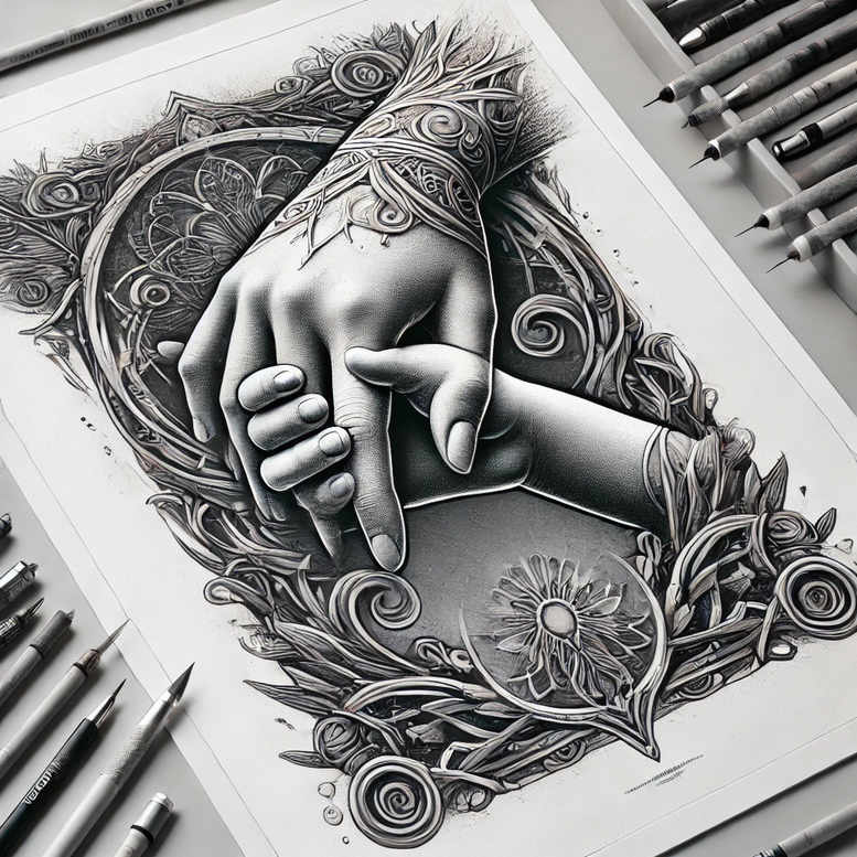 AI-generated tattoo project featuring two grayscale hands emerging from within an ornate mandala frame, surrounded by intricate geometric and floral motifs. Executed in a fine line tattoo style with black and grey shading, the composition emphasizes delicate linework, controlled gradients, and crisp negative space to achieve depth. The hands, rendered with precise contouring and subtle shading, interact at the center while the mandala exults in symmetry, balance, and pattern-rich detailing that winds around the wrist and forearm. The outer frame anchors the design, offering a versatile backdrop for placement on the forearm, upper arm, or back of the hand, and enabling both small tattoo designs and larger sleeves through extension. Symbolically, the pairing of hands conveys connection, support, and trust, while the mandala conveys unity and spiritual harmony; together they form a cohesive narrative of protection and self-reflection. The piece also invites future expansion into additional elements such as lotus flower tattoo motifs or infinity tattoo accents if desired, blending well with Japanese style tattoo influences when translated by a skilled artist. In terms of style and technique, this black and grey tattoo design leverages clean linework, subtle stippling for texture, and smooth shading to achieve a realistic yet refined look appropriate for meaningful tattoos and as a strong foundation for cover-up projects. As an AI-generated tattoo project, it demonstrates how digital concepts can translate into tattoo designs ready for inking, with particular suitability for cover-ups thanks to its dense dark areas and complex ornamentation that can mask prior ink.
