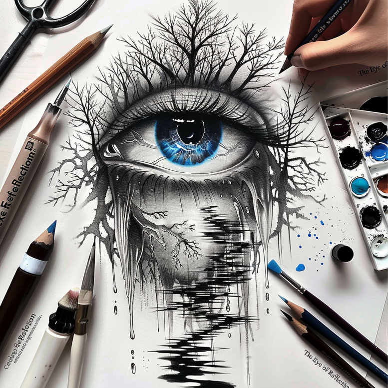 AI-generated tattoo project: This black-and-grey study centers on a vivid eye whose iris remains a striking blue accent amid an elaborate network of branches that fan across the lid and down toward a water-like reflection. The image is designed as a cover-up-ready concept, with dense shading, seamless transitions, and fine line details that can be adapted to conceal existing marks while delivering a powerful focal point. The main elements include the eye itself with a clearly defined blue iris, a branching motif that expands from the lashes in a tree- or root-like pattern, and a dripping ink effect that bleeds into the lower zone, suggesting motion and depth. Surrounding the central motif are visible art tools—pencil, brush, and palette—that imply the artwork is a studio idea and reinforce the design’s provenance as an AI-generated tattoo project. Technique-wise the piece relies on black and grey realism with precise line work, soft gradients, and subtle texture achieved through stippling and cross-hatching to create a lifelike eye while the branches remain delicate yet expressive. Symbolically, the eye can signify perception, awareness, or inner vision, while the branch network evokes growth, resilience, and the interconnected nature of life; the water reflection adds a sense of impermanence and duality. In terms of application, this concept works well as a cover-up thanks to its dense negative space, bold dark shading, and layered lines that can be extended or reduced to fit the chosen area, such as forearm, calf, or shoulder. As a contemporary tattoo design leaning into fine line aesthetics and realistic shading, it aligns with popular categories like meaningful tattoos, small tattoos, and flower tattoos, and it offers pathways to integrate motifs such as a lotus flower tattoo, infinity tattoo, tribal tattoo, or rose tattoo design within a custom tattoo design framework; the black and grey palette supports a Japanese style tattoo influence if desired, yielding a lasting piece of body art and ink. This is an AI-generated tattoo project, intended as a professional concept for artists and clients exploring bold black-and-grey body art, ink textures, and the interplay between form and shadow. Artists can adjust line density to preserve depth during healing, while keeping the branch pattern crisp in black and grey.
