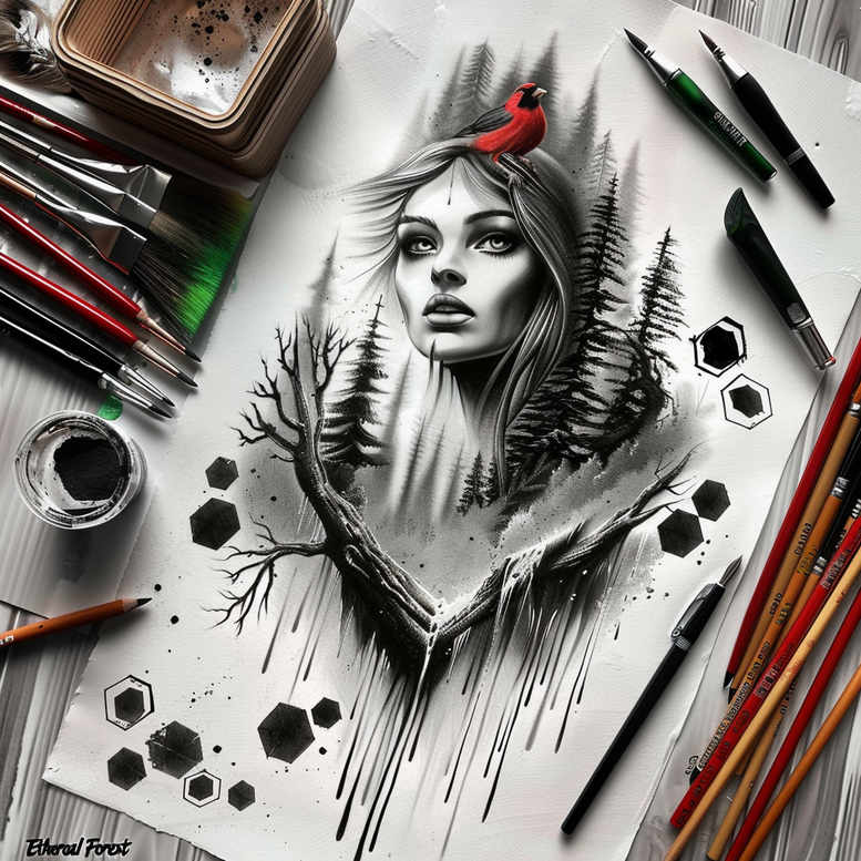 An evocative black-and-grey fine-line portrait tattoo concept, this piece centers a woman’s face crowned by a red bow, rendered with precise linework and soft shading. Surrounding her are fern fronds and drifting ink splatters that extend across the page, creating motion and depth. The composition juxtaposes botanical motifs with a lifelike portrait, leveraging negative space to keep the focal point strong while allowing the surrounding elements to breathe. The design reads as both a standalone study and a strong candidate for a cover-up, where darker areas can mask existing marks while the portrait remains legible. The treatment balances delicate contour lines with bolder silhouettes, making it adaptable from a small sleeve to a chest panel. From a tattoo design perspective, this concept embraces fine line technique, black and grey tone, and realistic shading, with potential for floral anchors such as lotus or rose motifs. It nods to Japanese style in balance and composition, while offering pathways for infinity or tribal accents if desired. The mood is contemplative and timeless, aligning with meaningful tattoos and making it suitable for a custom tattoo design. Although presented as a grayscale study, it translates well to ink on skin, preserving legibility at smaller scales and scaling effectively for larger work. For clients seeking a cover-up, the dense shading around the edges provides a natural camouflage, while the central portrait preserves identity. This is an AI-generated tattoo project intended to spark discussion on line weight, placement, and texture in real-world skin art. In sum, the piece fuses black and grey realism with botanical drama, offering a versatile design suitable for small details or expansive body art, and resonates with the broader repertoire of fine-line, flower, and Japanese-inspired tattoos. Symbolism centers resilience (fern) and memory (bow) with a calm gaze, complementing the ink as a commentary on impermanence.