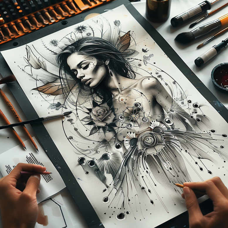 AI-generated tattoo project concept presented here features a black-and-grey portrait integrated with lotus petals and a mandala-inspired circle. Executed as a refined fine-line tattoo idea, the composition centers on a serene female face, framed by layered botanical elements and geometric radiance. The design sits atop a paper sketch, with pencil-grey value transitions suggesting delicate linework ready for transfer to skin. The mandala circle acts as a stabilizing focal point, its radial spokes and micro-ornament motifs providing symmetry to guide a wrist, forearm, or chest placement and to anchor flow within a larger sleeve or back-piece. The lotus motif blooming around the portrait signals spiritual awakening and resilience, while surrounding negative space and soft shading maintain clarity in translation to tattoo ink. The overall aesthetic embraces black and grey realism with fine-line precision, allowing subtle gradations of shade, stippling, and feathered edges that read well at small scales or extended canvases. This concept blends traditional motifs with contemporary craft, offering potential variations including Japanese style tattoo or tribal-inspired accents, depending on client vision. For meaningful tattoos, the symbolism is intensified by the pairing of the woman’s expression with lotus and mandala, suggesting inner strength, balance, and transformation, with the possibility of personal initials or dates woven into the circle. In terms of technique, the design stresses clean line weight, controlled contrast, and careful accommodation of skin texture, ensuring longevity of the ink. This is an AI-generated tattoo project concept, intended to inspire tattoo designers and clients seeking a sophisticated, versatile image ready for custom tattoo design, suitable for small tattoos or larger body art pieces that stay timeless in black and grey ink.
