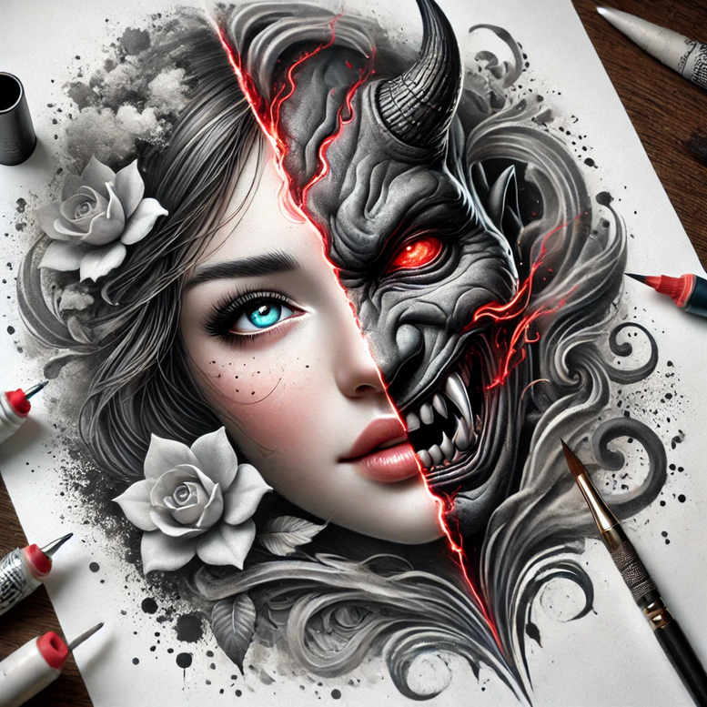 This tattoo concept presents a dramatic split-face composition that fuses portrait realism with a sinister demonic element. The left hemisphere features a refined female portrait rendered in black and grey with soft shading, delicate features, and hair that frames the temple, while the right hemisphere reveals a stylized demon skull emerging in high-contrast blacks and greys, punctuated by a single piercing red eye that adds a focal point and intensity to the piece. A jagged, diagonal division runs from temple to jaw, creating bold visual tension and guiding the eye from light to dark. The surrounding motif of roses anchors the design and provides natural framing, with fine-line detailing and stippling to texture petals, leaves, and lace-like shading. The concept explores duality: beauty and menace, humanity and otherworldly force, a theme well-suited to a large back or sleeve piece, or to a chest tattoo that transitions into rib geometry. The composition leans on black and grey realism with botanical ornament, making it a versatile template for a custom tattoo design that suits meaningful tattoos or statement pieces. The roses symbolize beauty amidst darkness, the demon skull embodies inner conflict or resilience, and the division line suggests a boundary between two identities, a narrative that can be extended with additional symbolic motifs according to the wearer’s story. For cover-up purposes, the rich dark shading on the demon side provides opacity to obscure older ink, while the lighter left side offers negative space for new imagery to breathe. This project, an AI-generated tattoo concept, can be adapted to Japanese style influences or blended with fine-line realism, offering a versatile canvas for black and grey body art or color-ink integrations as desired. In practice, a tattooist might refine the line weight, add subtle gradient transitions, or incorporate other motifs such as lotus flower tattoo elements, infinity-inspired curves, or tribal linework to tailor the piece to the client’s aesthetic. When planning a session, consider placement that allows seamless gallery-like transitions across a shoulder, chest, or forearm, balancing scale with skin texture, age of existing ink, and the wearer’s lifestyle. The crafted design serves as a study in contrast: the tenderness of the human visage against the stark geometry of the demonic form, inviting interpretation as a personal emblem of transformation and endurance.