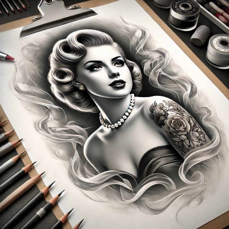 AI-generated tattoo project concept rendered in black and grey ink, this piece presents a vintage pin-up woman emerging from a soft cloud of shading. The focal point is the woman’s face and shoulders, framed by a delicate pearl necklace, while a bold upper arm tattoo peeks through with an intricate floral pattern that reads as both bouquet and mural. The design blends realism with timeless tattoo motifs: a refined portrait silhouette, smooth gradients from light to deep shadow, and a floral tapestry that unifies skin, ink, and craft. The line work pursues a careful balance of clean contouring and fine line details, creating crisp edges for the figure and a delicate weave for the flowers, while the shading anchors the composition in three-dimensional form. Visible elements include woman, necklace, tattoo, flower, arranged to convey harmony between elegance and edge. The flower motif supplies meaning—beauty, growth, memory—while the pin-up stance evokes nostalgia and empowerment, giving the overall tattoo design a dual narrative suitable for meaningful tattoos or more personal storytelling. Because of its dense pattern and controlled negative space, the piece could function as a strong cover-up concept for darker existing work, especially on the upper arm or back. In terms of technique, the work leans into black and grey realism with attributes of fine line tattoo, relying on gradients, stippling, and precise line tension to render lifelike skin tones and a convincing floral texture. The composition also hints at Japanese style tattoo sensibilities—curved forms, balanced asymmetry, and an emphasis on flow—while remaining adaptable to cultural tastes and client preferences, from small tattoos to larger panels. As an AI-generated tattoo project concept, it showcases how digital ideals translate into tangible ink-ready design, preserving symbolic resonance, and offering room for personalization, such as adjusting flower species, necklace style, or background shading to suit individual skin tone, placement, and meaning, while staying faithful to the timeless appeal of black and grey tattoo art, and the enduring allure of flower and portrait motifs in modern body art, ink.