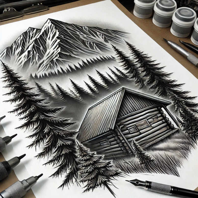 This composition presents a cabin nestled among a dense pine forest in black and grey ink, rendered as a realistic tattoo design suitable for a cover-up. An AI-generated tattoo project concept, it explores atmospheric shading, fine line detailing, and careful negative space to create depth between the cabin and trunks. The main elements—a cabin, a serried line of pines, and the surrounding wilderness—are treated with precision: crisp roof lines, textured wood, and evergreen silhouettes that fade into distance. The motif speaks to solitude, resilience, and a quiet connection with nature, turning a simple shelter into a symbolic refuge. Technique centers on black and grey shading, restrained highlights to emphasize windows and roof edges, and smooth gradient transitions that hold up at different scales. For tattoo purposes, the layout is adaptable for a forearm, calf, or back piece, preserving readability of the needlework as a realistic tattoo even when reduced. Because the scene is dark, it is well-suited as a cover-up concept, with careful saturation and contouring to obscure older work. This design aligns with trends in custom tattoo design emphasizing meaningful tattoos, nature-inspired imagery, and black and grey realism. The forest motif nods to Western landscape traditions while keeping a timeless, understated vibe. Keywords such as tattoo, tattoo design, meaningful tattoos, fine line tattoo, lotus flower tattoo, infinity tattoo, tribal tattoo, rose tattoo design, small tattoos, flower tattoos, custom tattoo design, Japanese style tattoo, black and grey, realistic tattoo, body art, ink are relevant here and help collectors locate this concept. If expanded, the composition can become a larger scene with deeper forest depth; if pared down, the cabin and pines retain legibility on smaller surfaces. AI-generated tattoo projects like this example invite exploration of tattoo design boundaries while honoring classic forest iconography. For enthusiasts seeking a cover-up-ready piece, the dark values will anchor new ink over older work, and the simple silhouette ensures readability at multiple sizes.